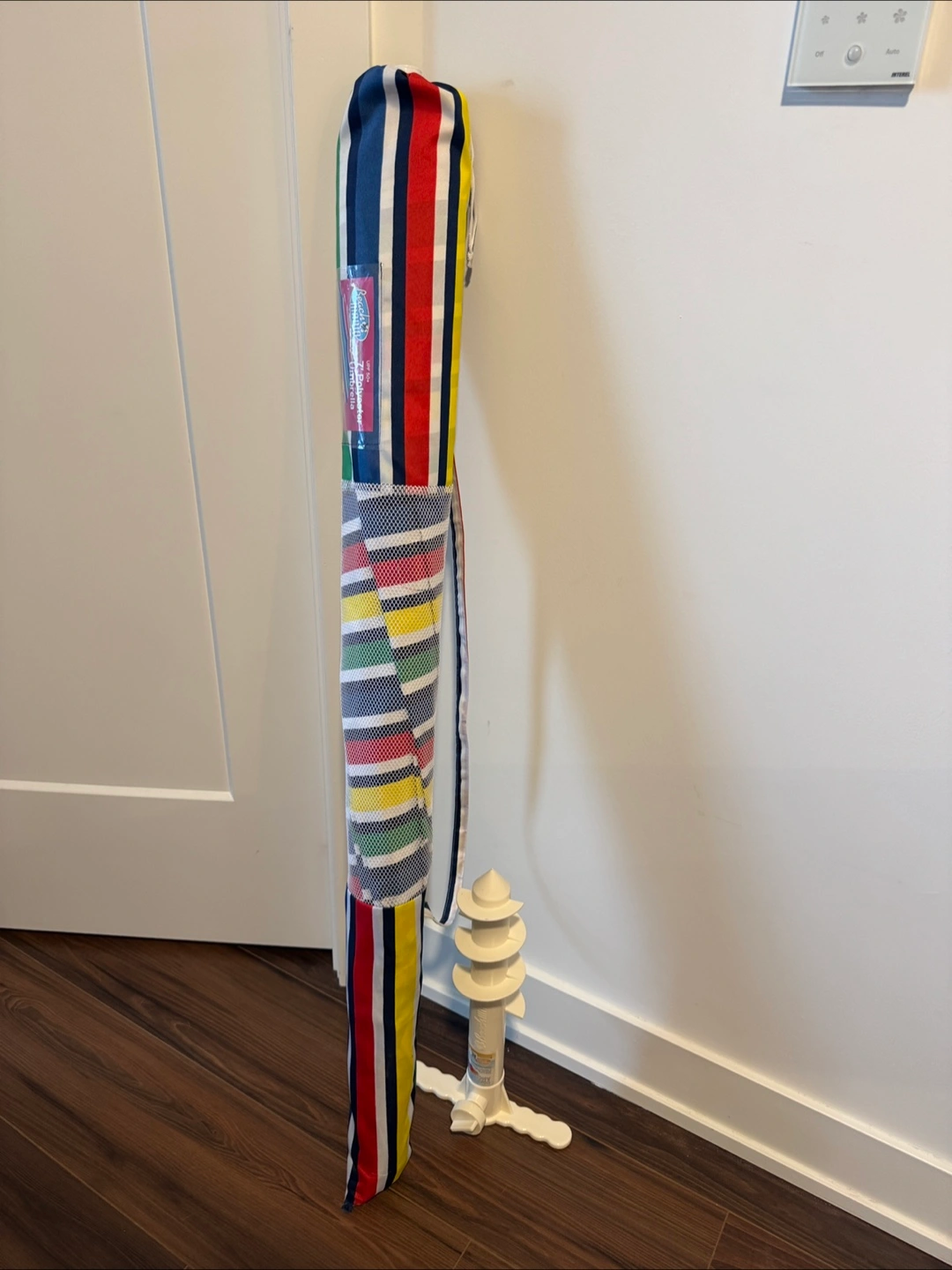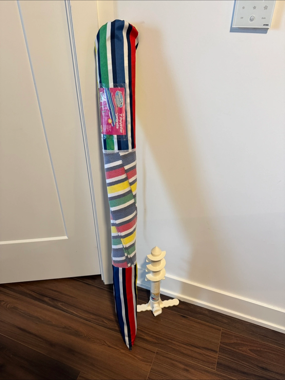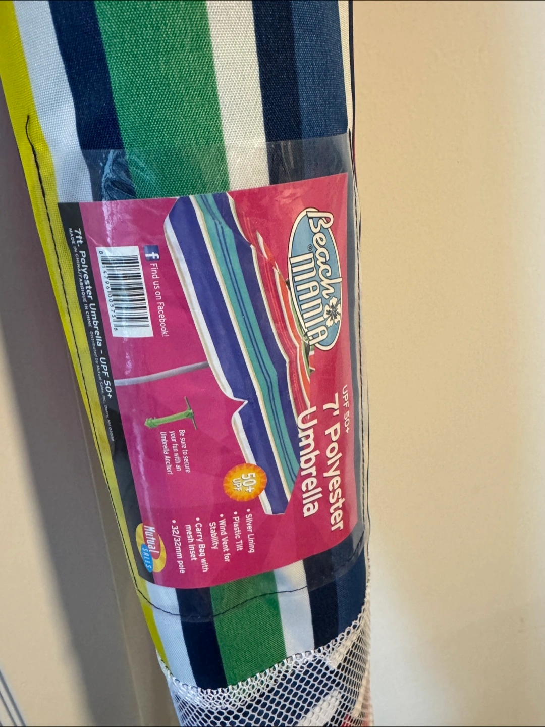 Selling a Beach Mama 7' Polyester Umbrella. It's a colourful striped umbrella with UPF 50+ protection. It also features a strong lining, plastic tilt for stability, and a carry bag with mesh insert