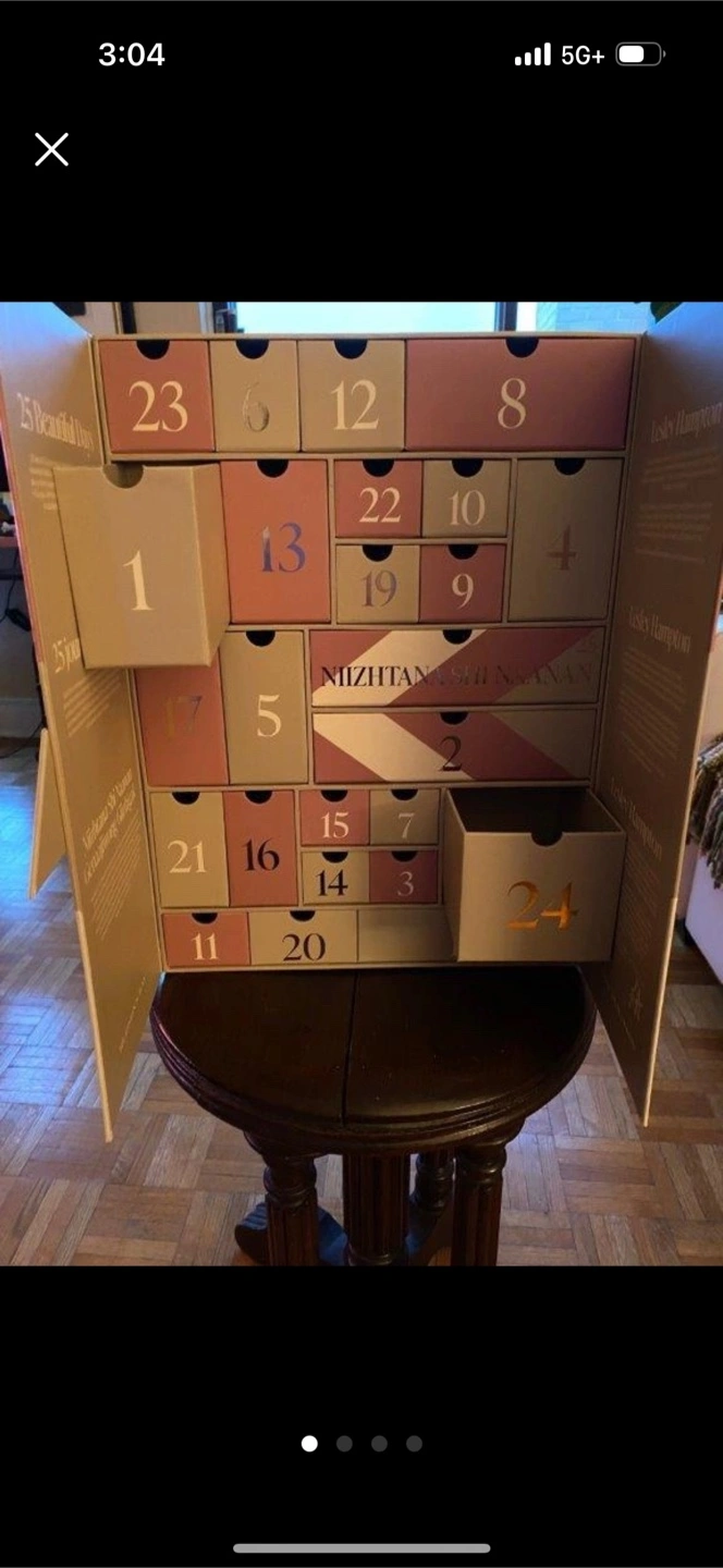 Selling an empty and unique calendar box with 25 different compartments. It has not been used other than emptying the beauty contents when first purchased. It has a unique design with numbered drawers. It is in pristine condition. It is quite sturdy and has a magnetic clasp closure in the front. Weighs 7.2 lbs.