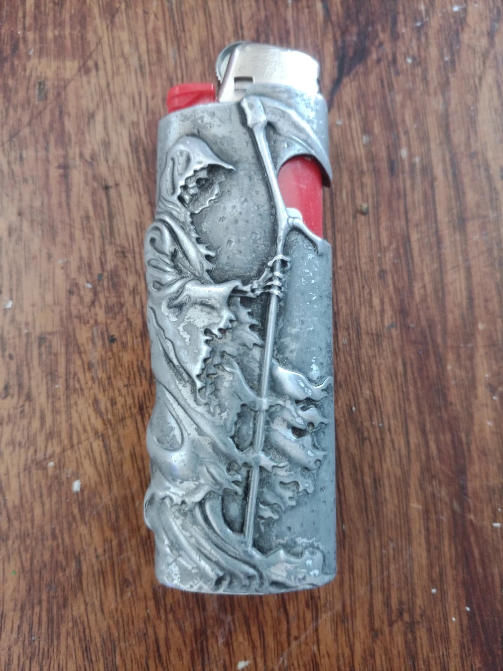 Cool custom Bic lighter sleeve featuring the Grim Reaper. It's in good condition and has a really unique design. Perfect for collectors or anyone who wants to add some edge to their everyday carry