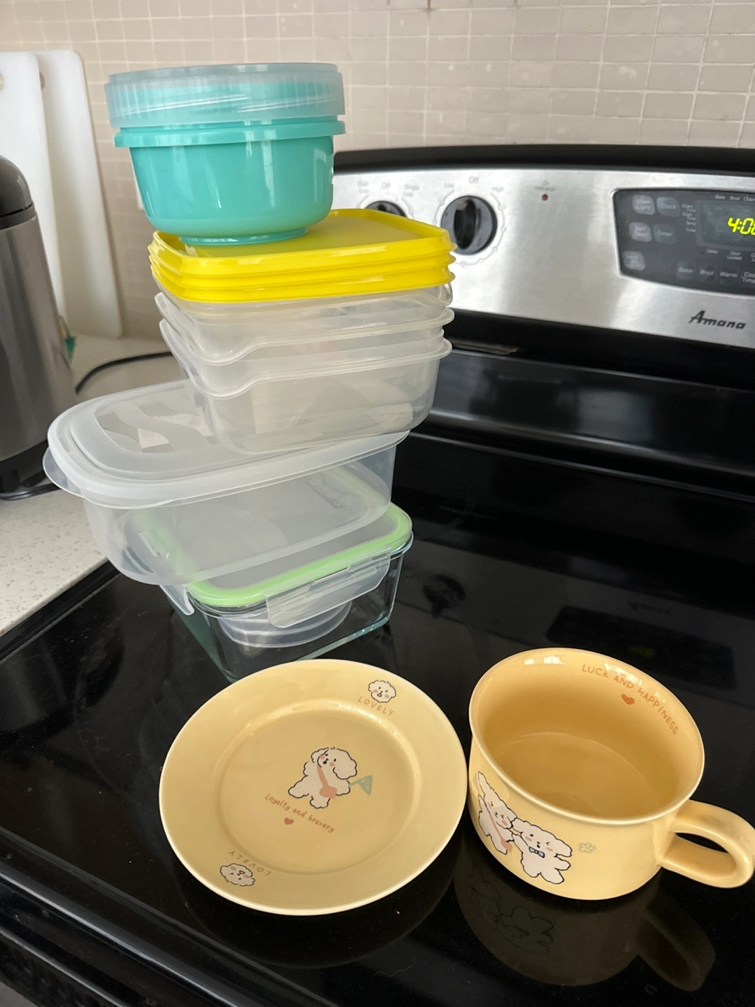 Selling a set of assorted food containers in various sizes and colours, perfect for meal prep or leftovers. Also included is a cute plate and mug set with a dog design, adding a touch of fun to your meals!