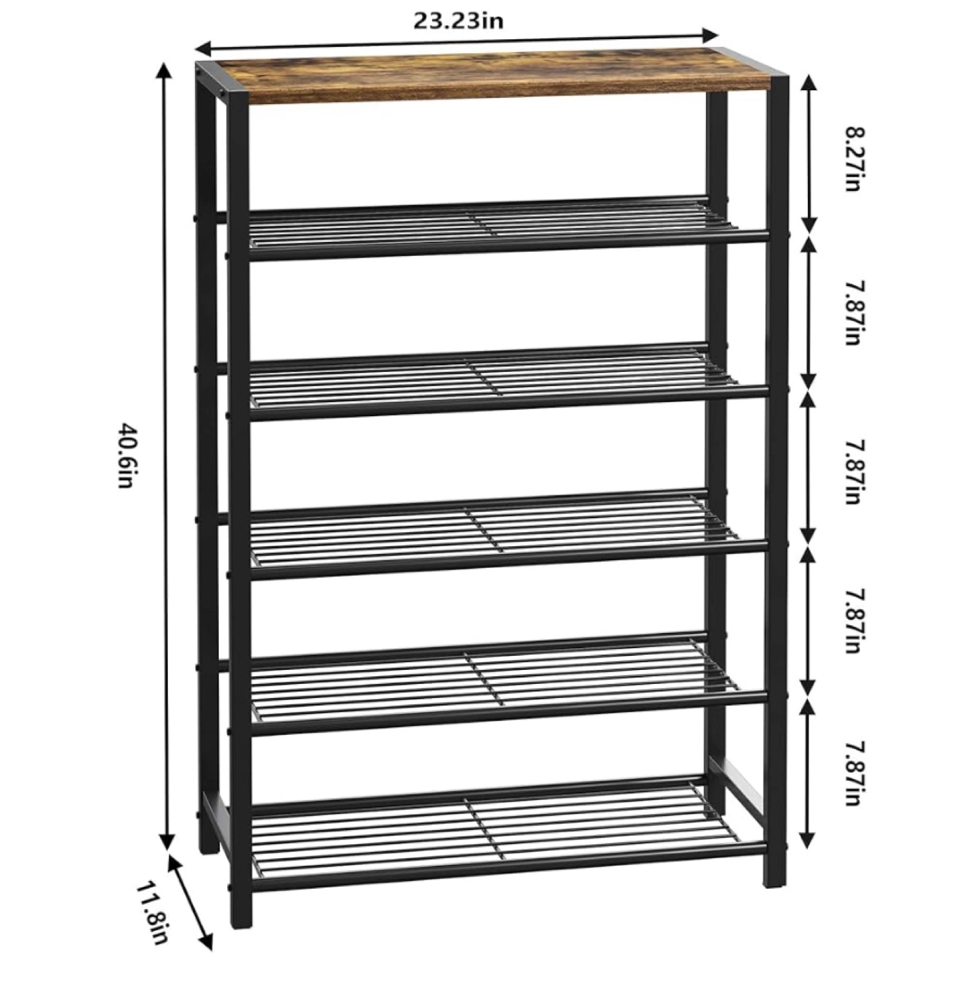 160Declutter your entryway or closet with this sturdy 6-tier metal shoe rack! It's perfect for organizing your shoes and keeping them off the floor. The rack features a wooden top shelf and black metal frame. It measures approximately 23.23 inches wide, 40.6 inches tall, and 11.8 inches deep.