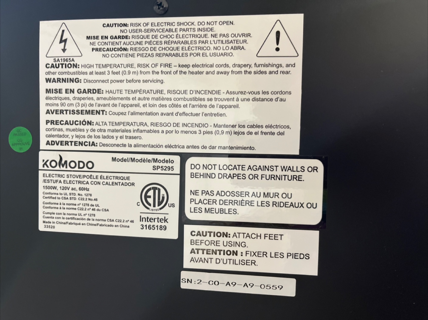 ✨Like New✨ ✨Moving Sale✨ Selling a Komodo electric stove/poêle électrique/estufa electrica con calentador. It's in great condition and ready to keep you warm this winter! Model number is SP5295. It's 1500W, 120V AC, 60Hz. ***Smoke free, pet free home***