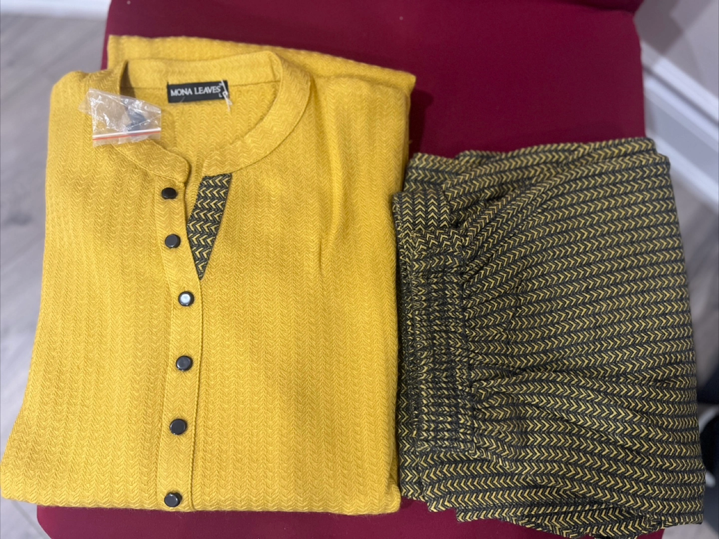 This is a beautiful Mona Leaves kurti set in a lovely yellow colour. It comes with a matching pant palazzo . The size is large. This is 2 pieces set with pockets.