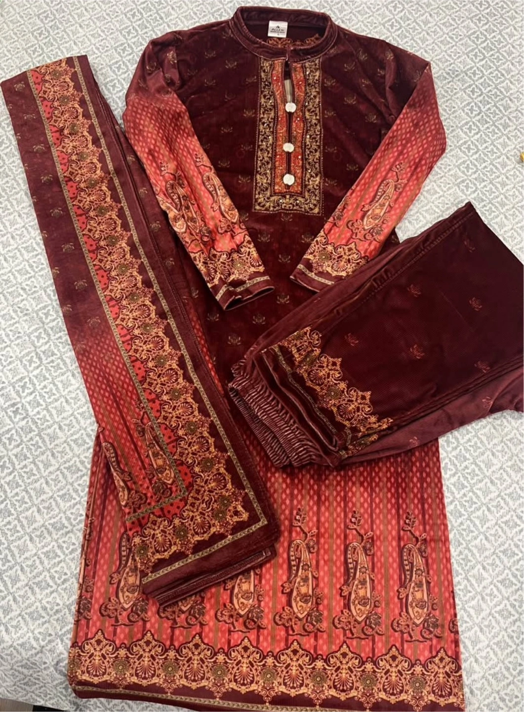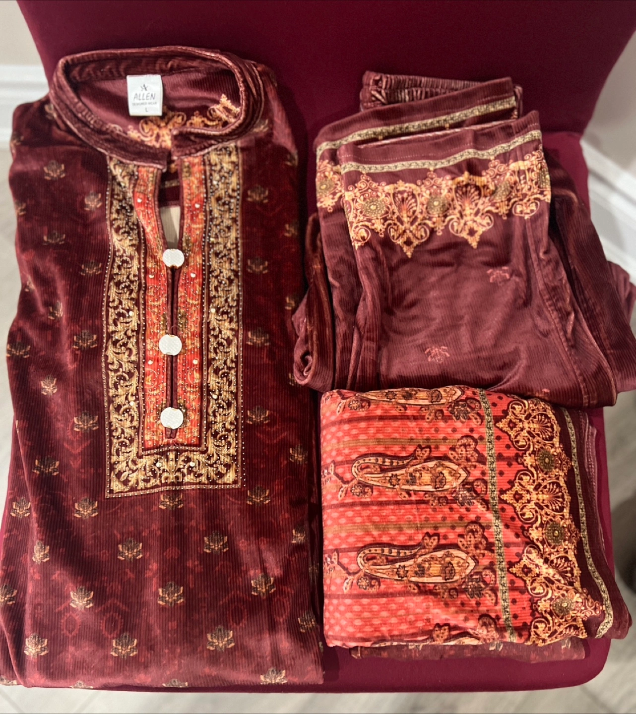 Beautiful Allen brand pant palazzo kameez suit in a rich burgundy velvet! It comes with the kameez (top), palazzo (pants), and a matching dupatta (scarf). The fabric is soft and luxurious, perfect for a special occasion or just feeling a bit fancy.