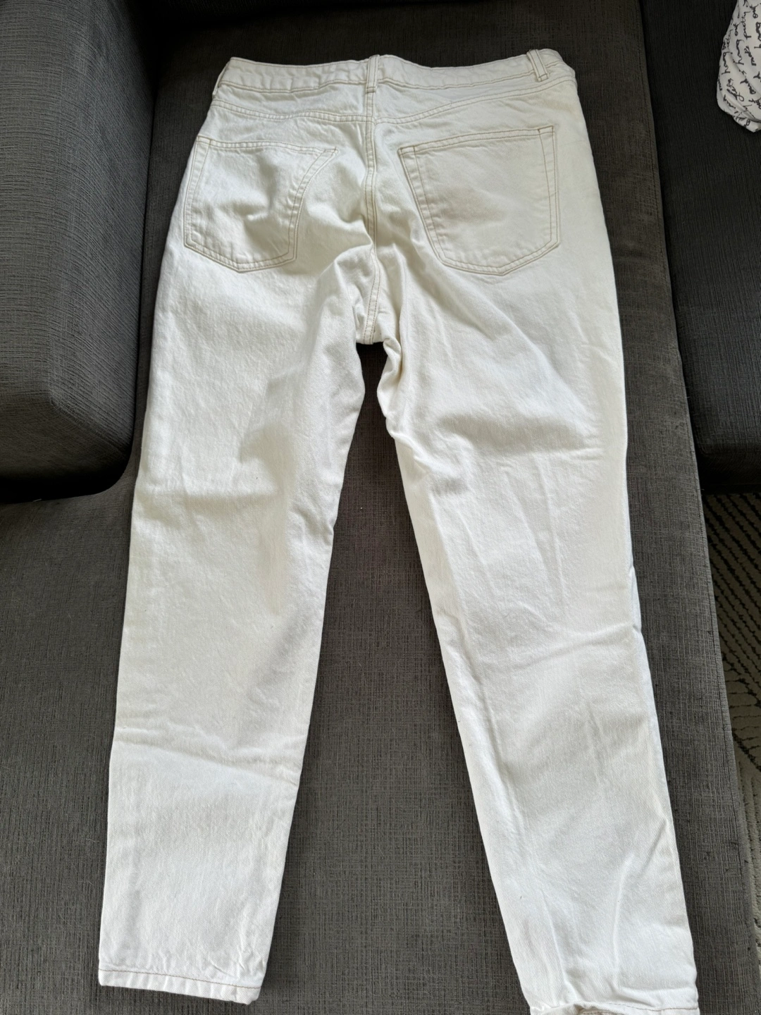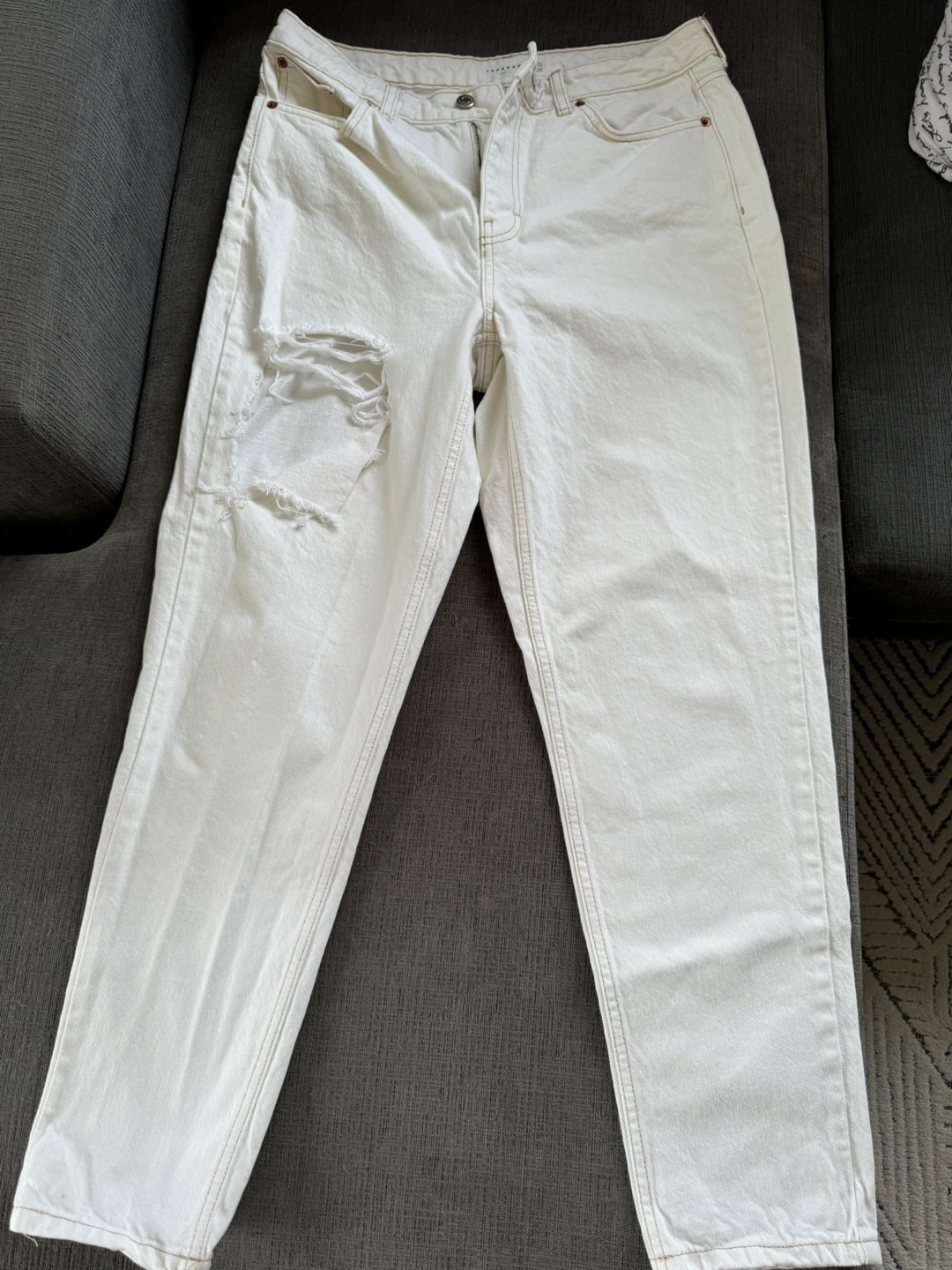 Selling a pair of Topshop Mom jeans in white. They are a size W32. These jeans have a stylish, distressed look with a ripped detail on one leg. Perfect for a casual and trendy outfit!