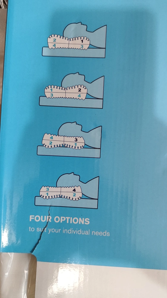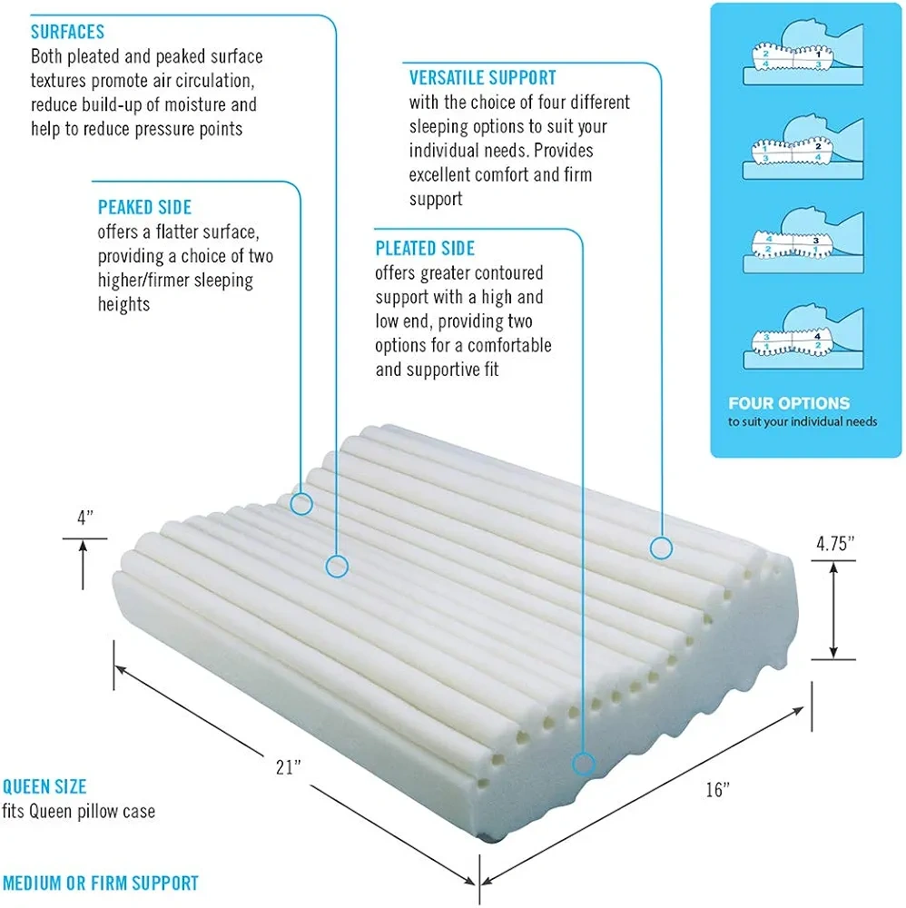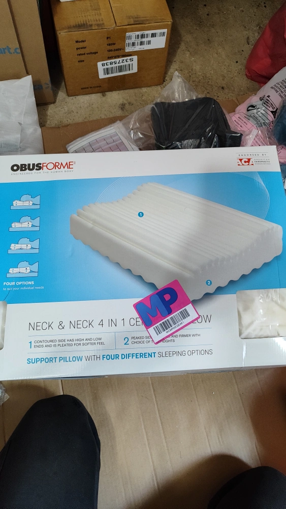 I'm selling an ObusForme Neck & Neck 4 in 1 support pillow. It features surfaces with pleated and peaked textures to promote air circulation, reducing moisture and pressure points. It also provides versatile support with four different sleeping options to suit your individual needs, offering excellent comfort and firm support. The pillow offers a flatter surface with a peaked side and a contoured support with a high and low end with a pleated side for a comfortable and supportive fit. It's queen size, fitting a Queen pillow case