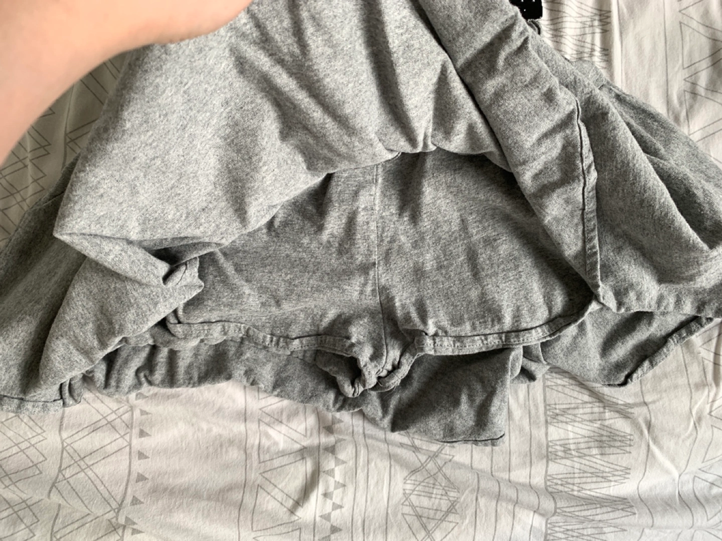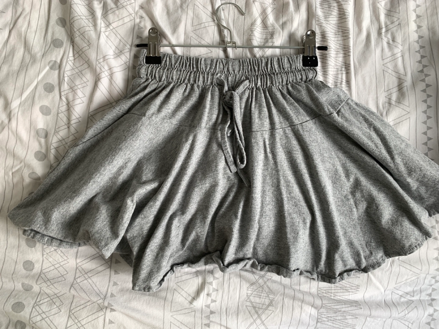 Selling a cute grey mini skirt! It's in great condition and perfect for summer. The skirt has a comfortable elastic waistband and a tie for a snug fit. It's a versatile piece that can be dressed up or down, making it a great addition to any wardrobe