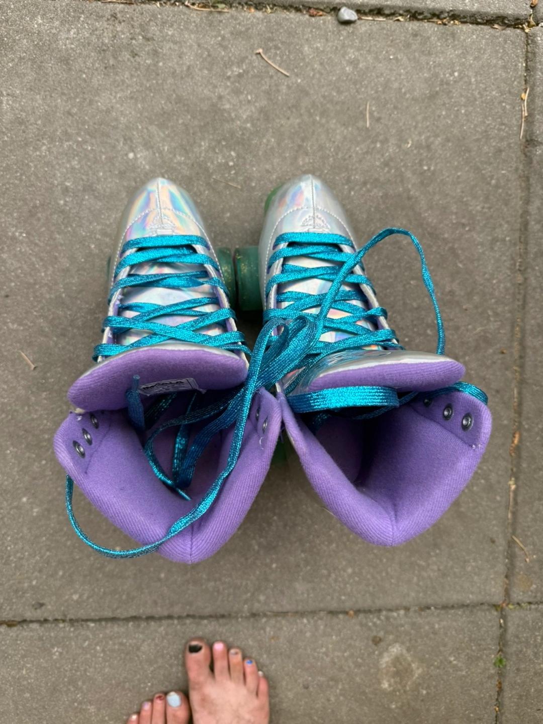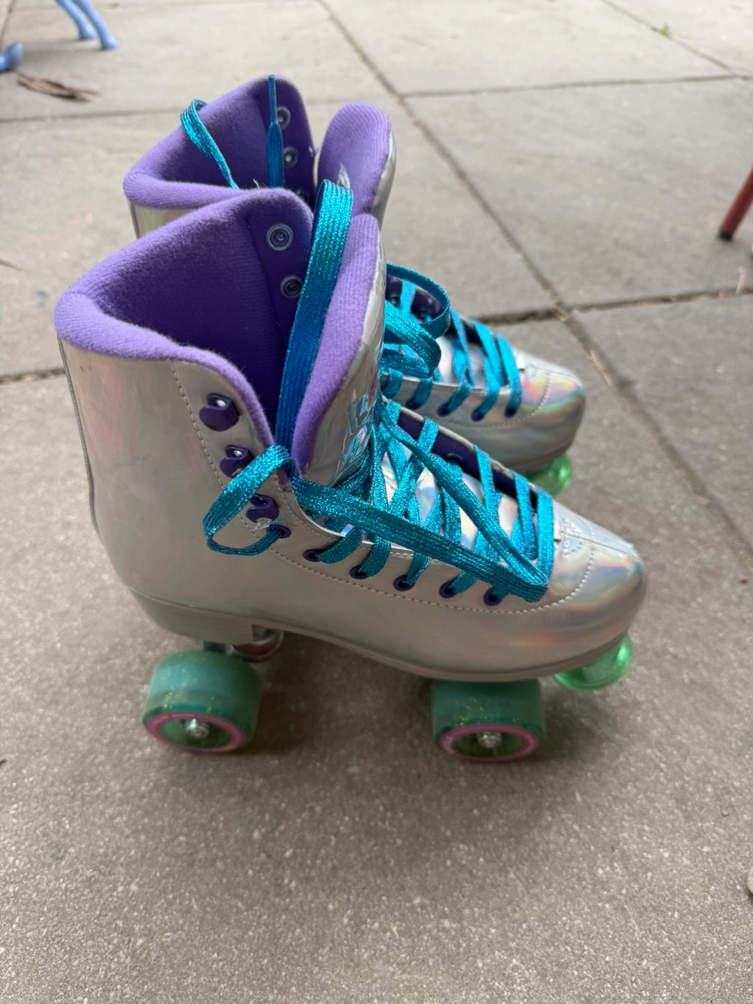Selling a pair of Impala roller skates! They're a size 7 and feature a cool iridescent finish with purple lining and teal wheels and laces. Perfect for some fun at the roller rink or outdoors!