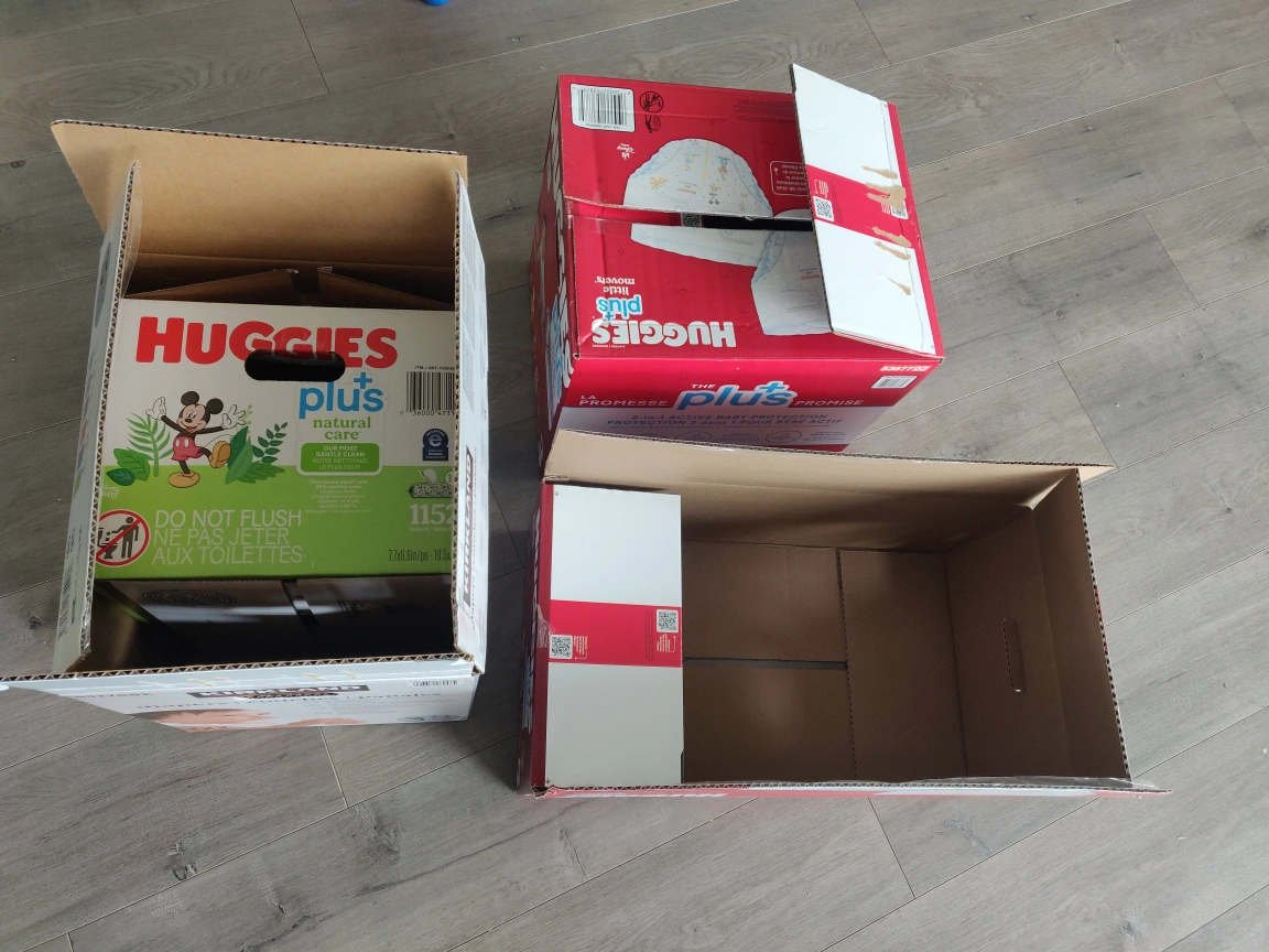 Selling empty Huggies diaper boxes. One is for Huggies Plus natural care, and the other is for Huggies Little Movers Plus. Great for storage or crafts!