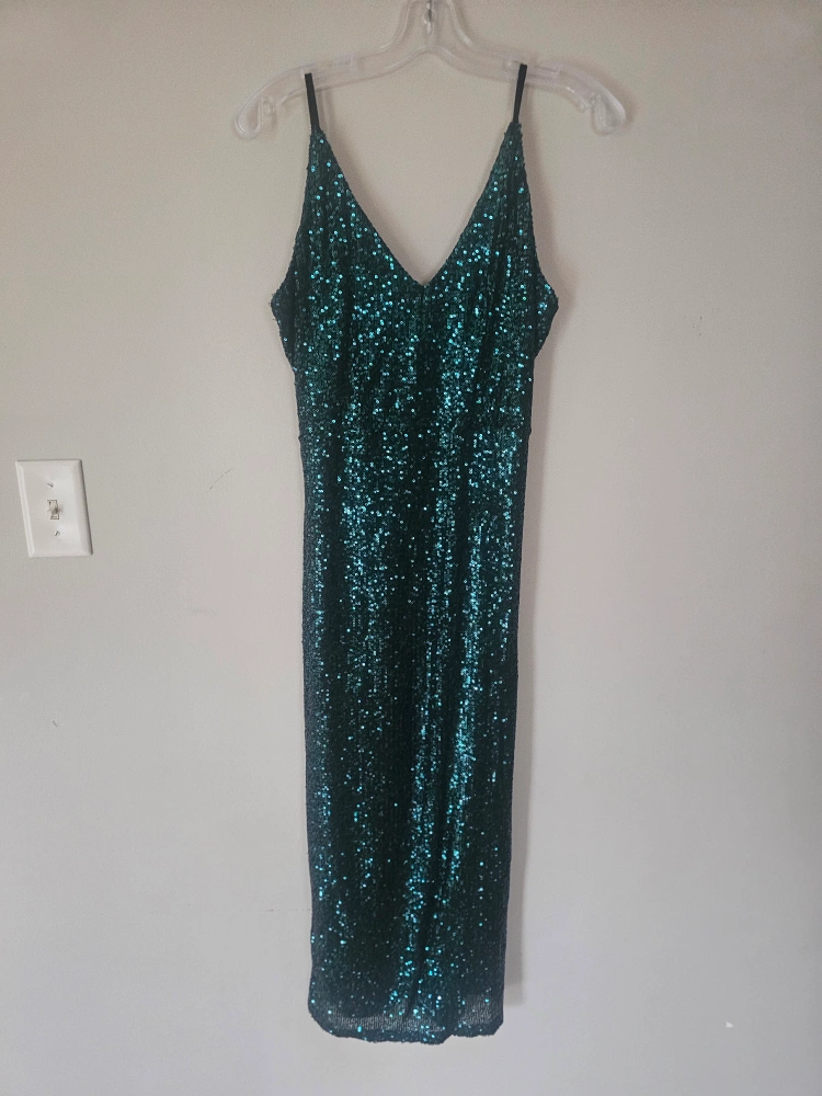 85This is a beautiful green sequin dress with a V-neck. It's perfect for a night out or a special occasion.