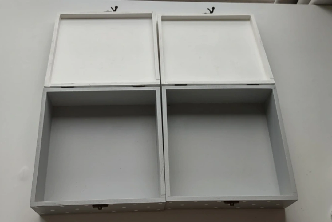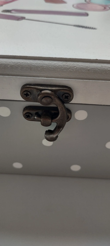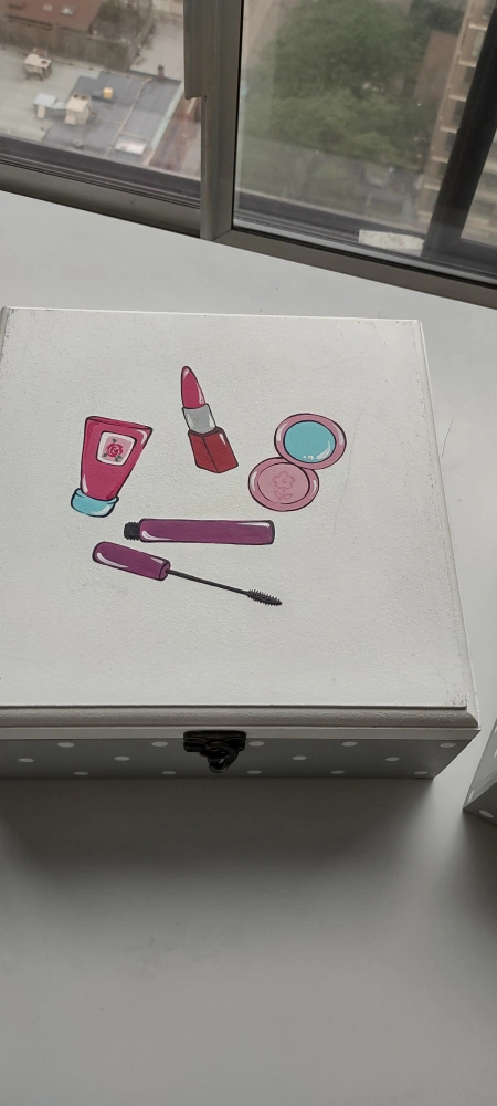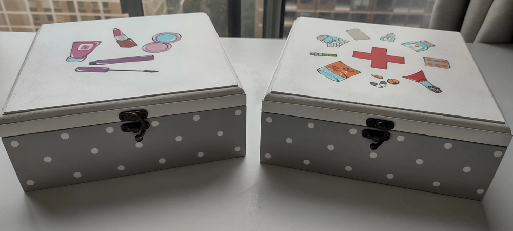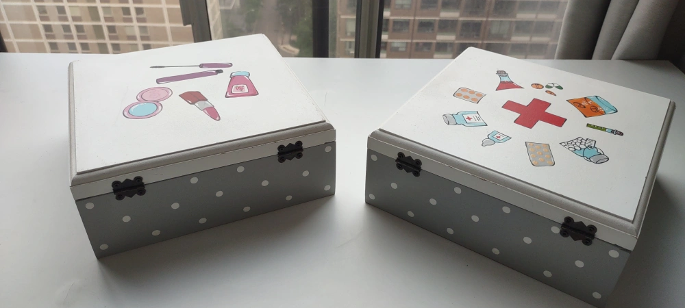 Selling two decorative storage boxes. One has a makeup design on the lid, and the other has a first aid design. They both have grey polka dots on the sides and a metal clasp. it made very strong wood. not samll. each price $11