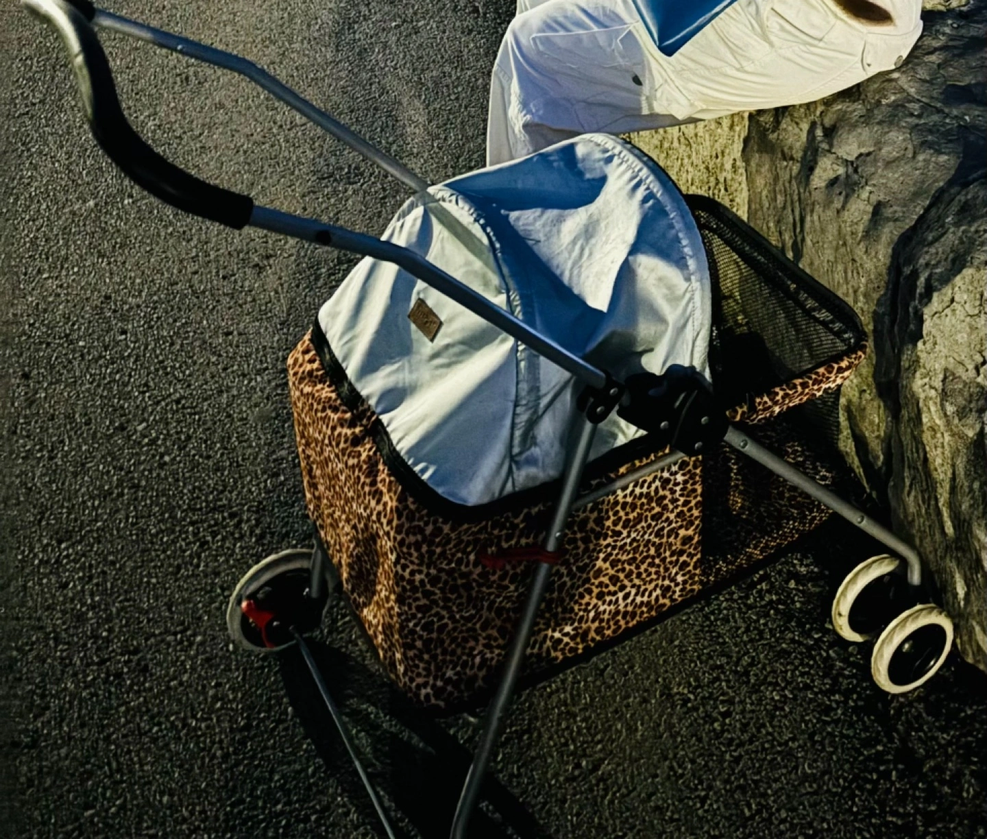 Selling a pet stroller with a fun leopard print design! It's perfect for taking your furry friend on walks or errands. The stroller appears to be in good condition and ready for a new home. It has a black interior and a black mesh.