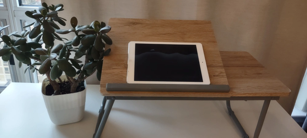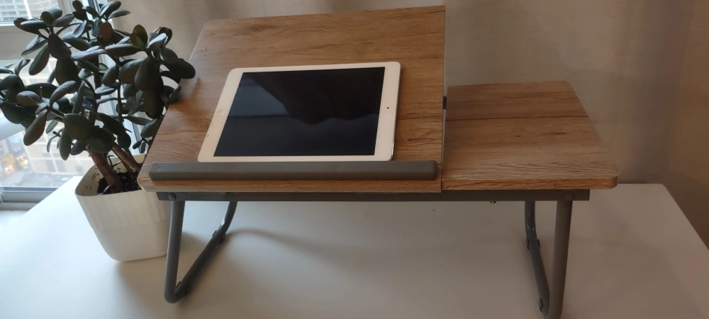 1000+Selling a handy portable laptop desk! It's perfect for working or browsing from the comfort of your bed or couch. It features a light wood-grain finish and foldable legs for easy storage. Height adjustable.