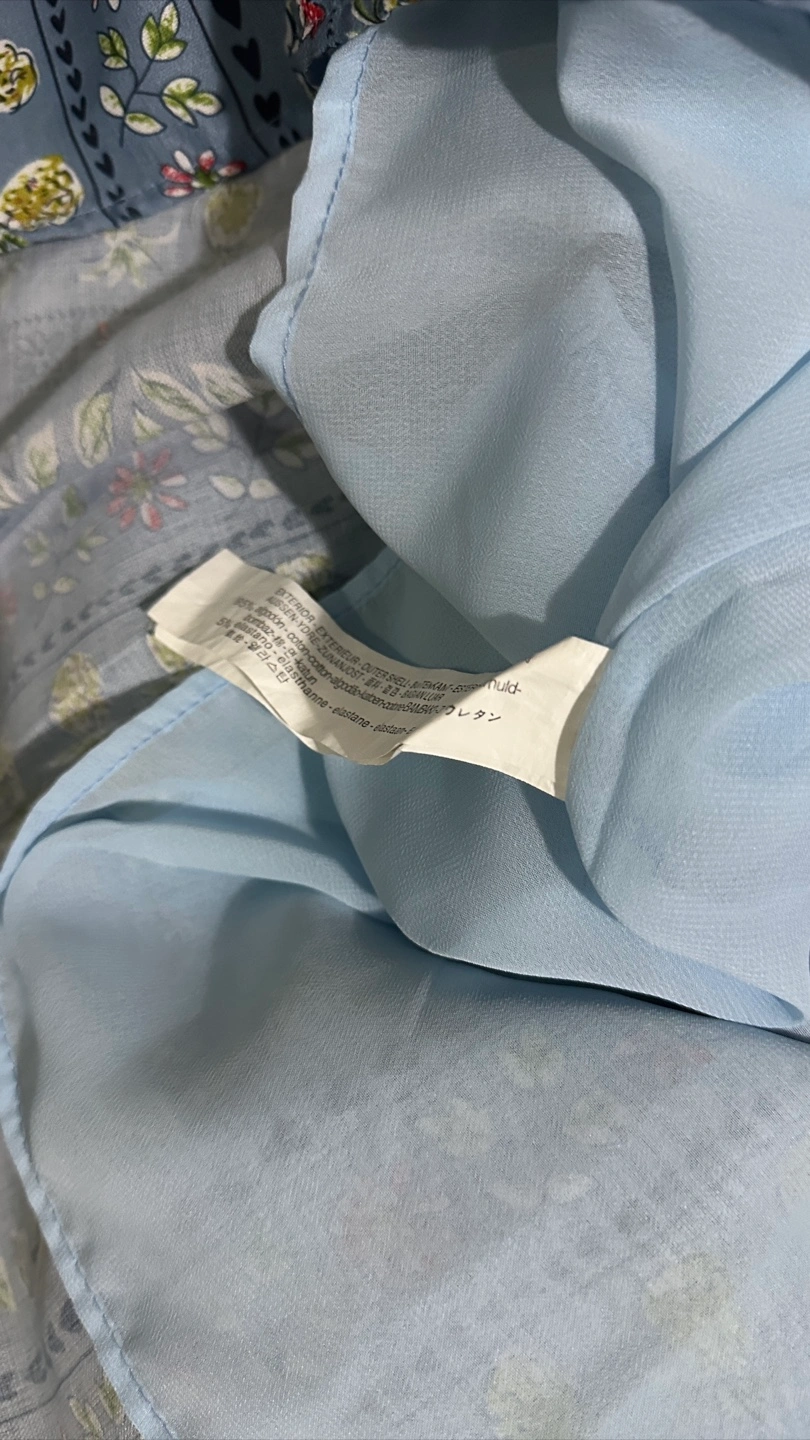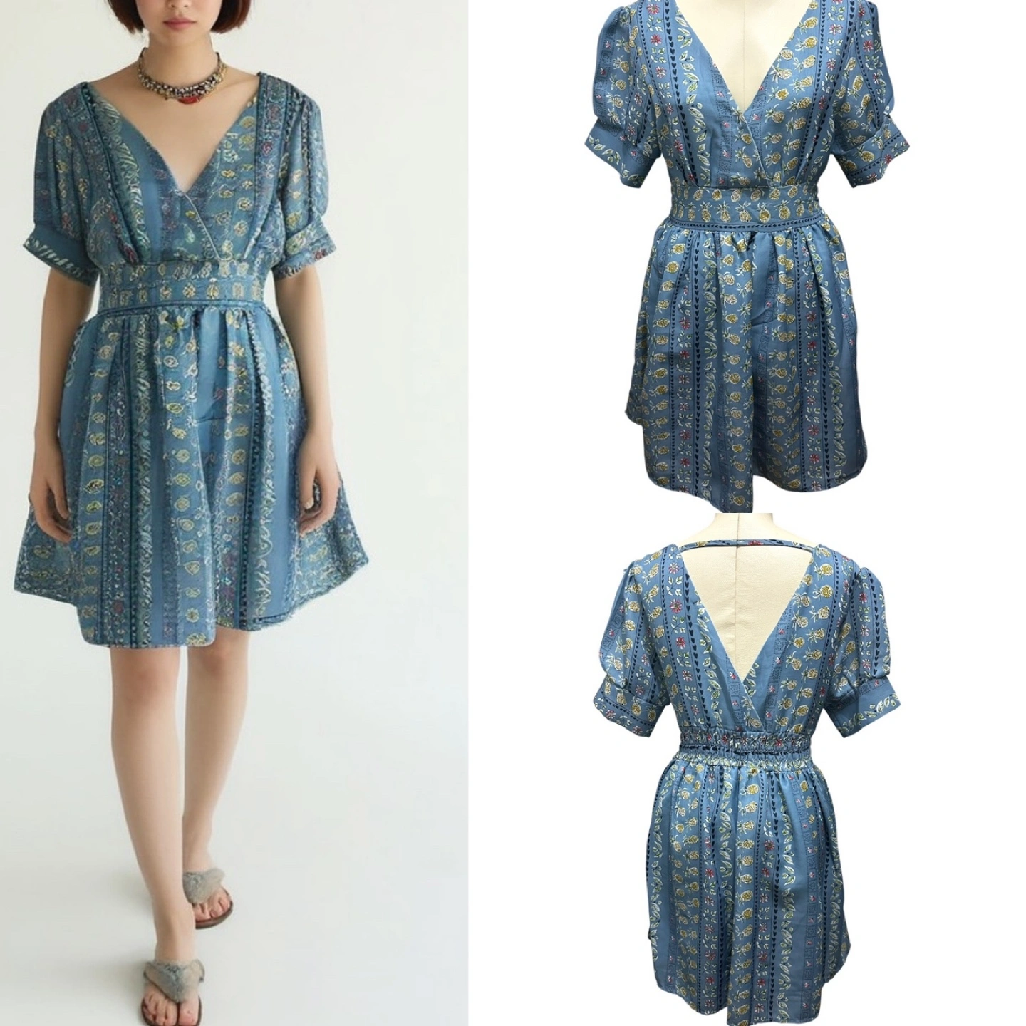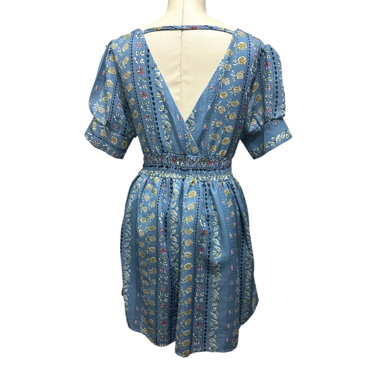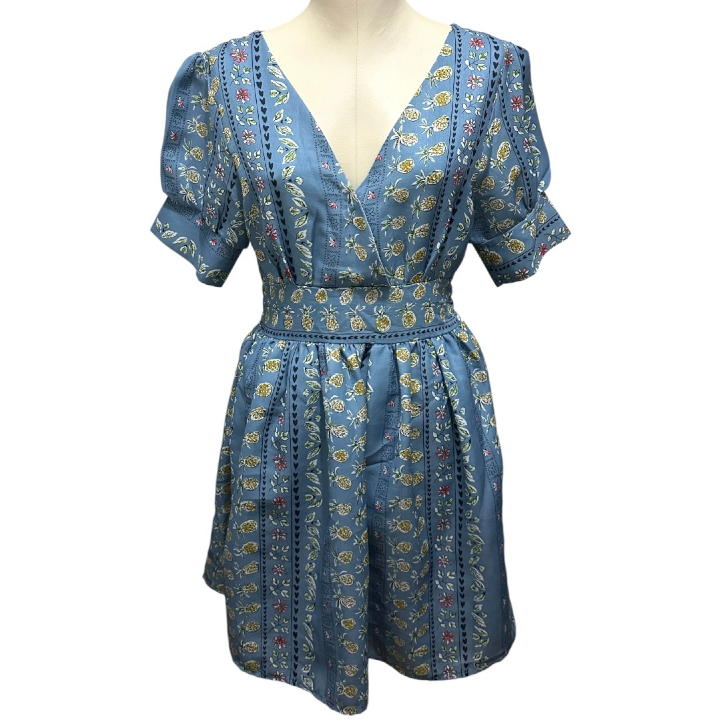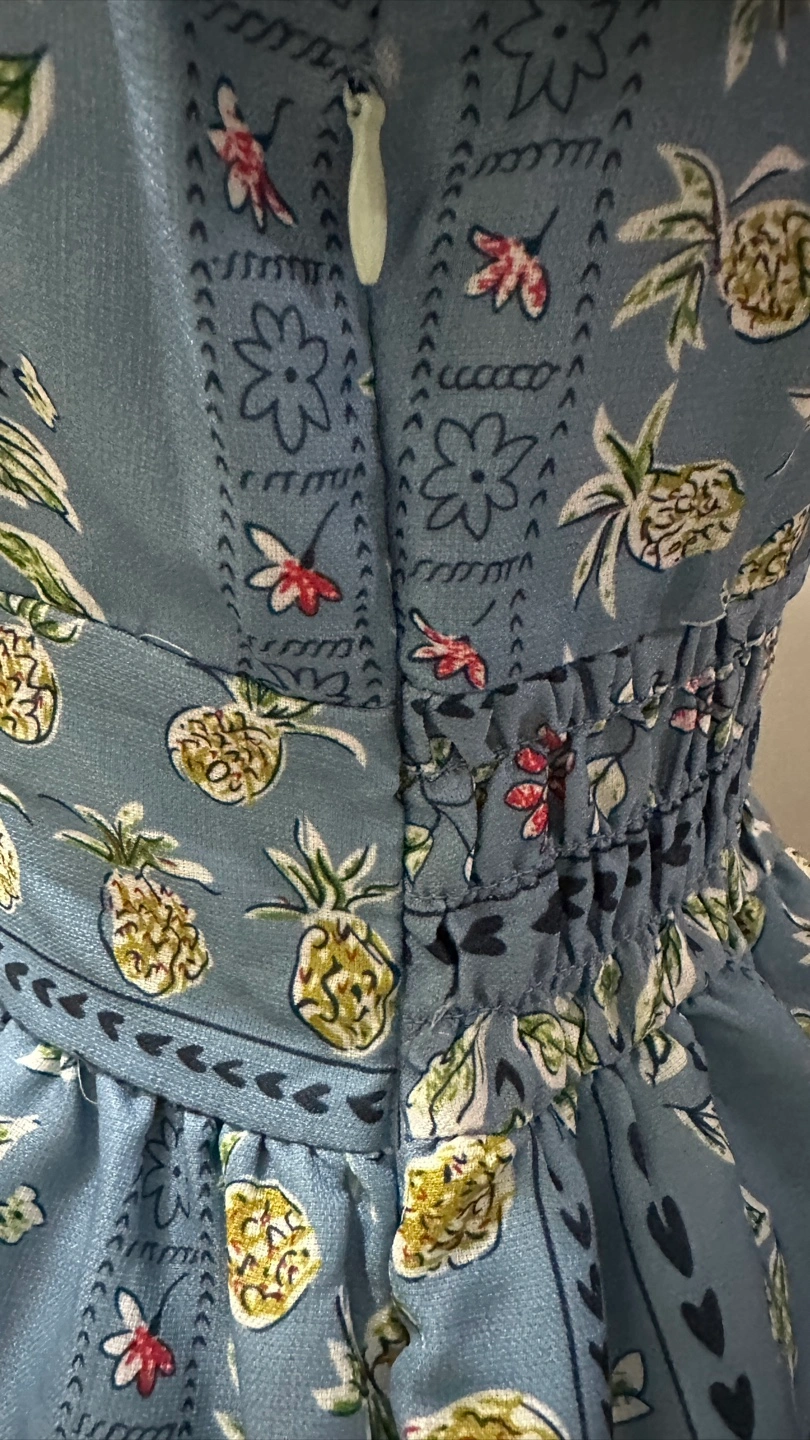• Brand: ASOS Women • Condition: No visible stains, holes, or fading. Color appears even and vivid. • Style: Short puff-sleeve dress with a deep V-neckline (front and back), zipper on the side. • Color/Pattern: Blue with vertical floral and pineapple prints • Material: 95% cotton, 5% elastane (exterior); lined interior • Size: US S / UK 8 / FR 36 / DE 34 • Made in: China Measurements: • Chest: 16.5” • Body Length: 33.5” • Sleeve Length: 9.5” Care Instructions (from label): Machine wash cold (30°C / gentle cycle). Do not bleach. Do not tumble dry. Iron at max 110°C. Do not dry clean.