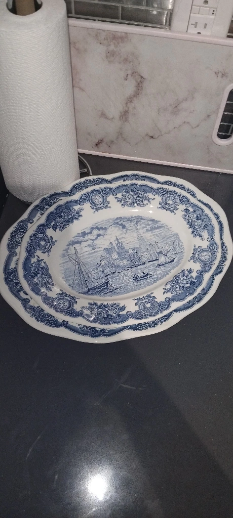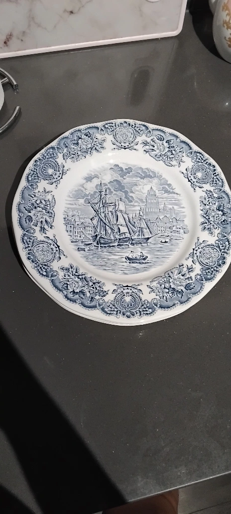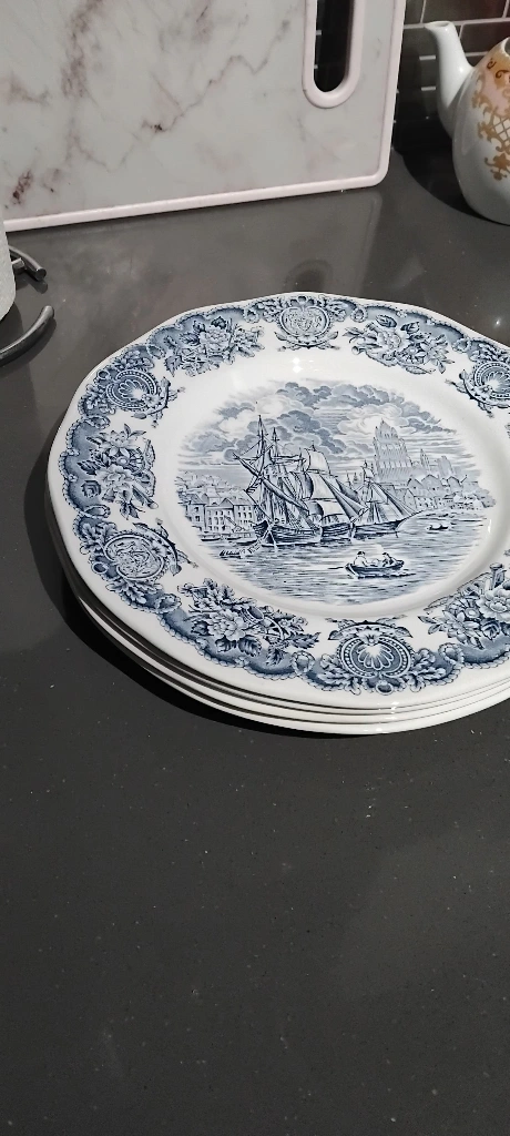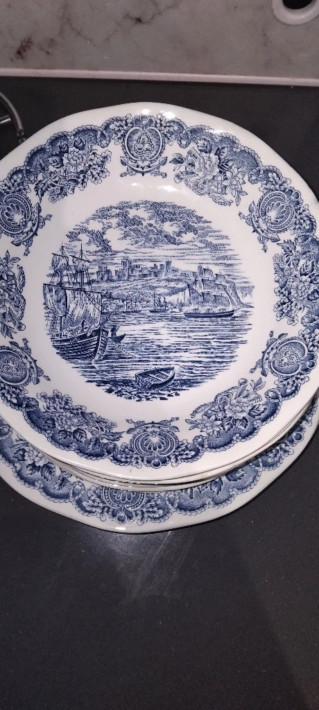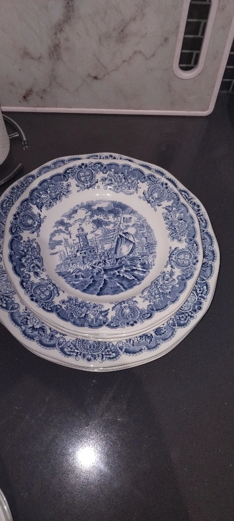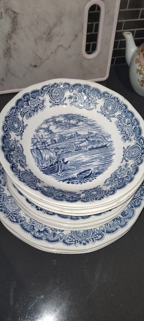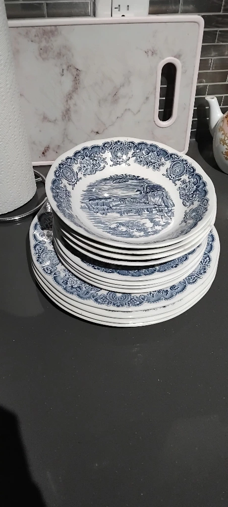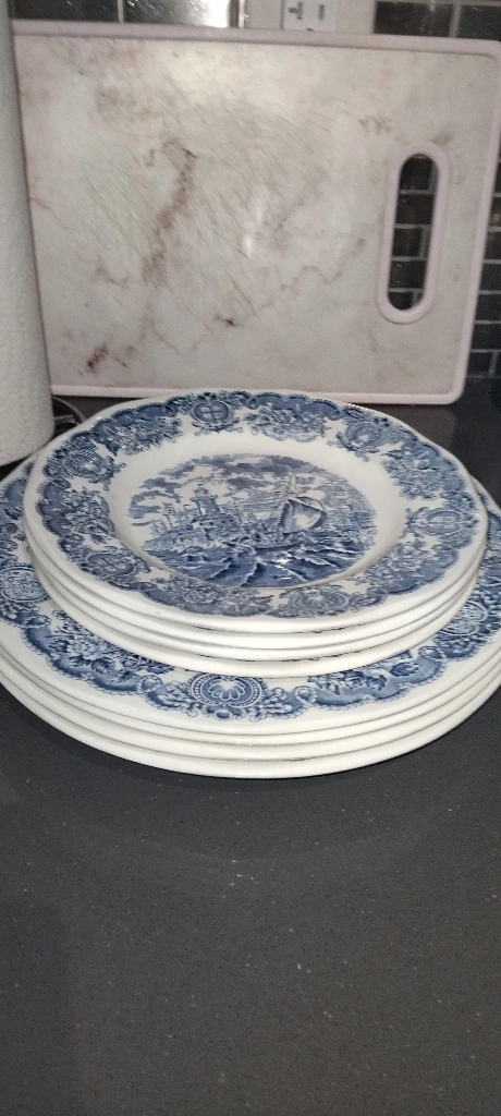 Selling a set of Johnson Brothers 'Coaching Scenes' dinner plates. They feature a charming blue and white design with a vintage feel. Perfect for adding a touch of classic elegance to your dining table! 4 pieces from each and extra 2 large plates usually used for rice