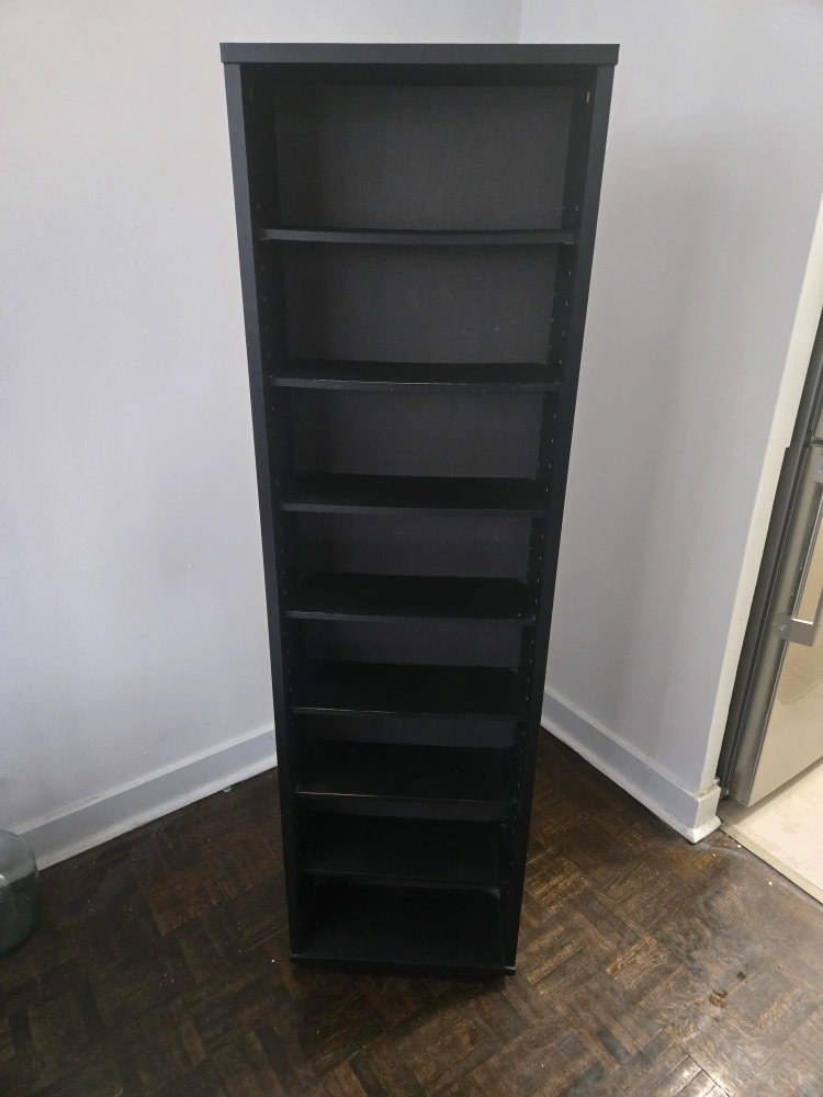 Selling a black bookshelf in good condition! It has lots of shelves for storage. Perfect for books, decor, or anything else you need to organize. It's a simple and functional piece! It rotates and its compact