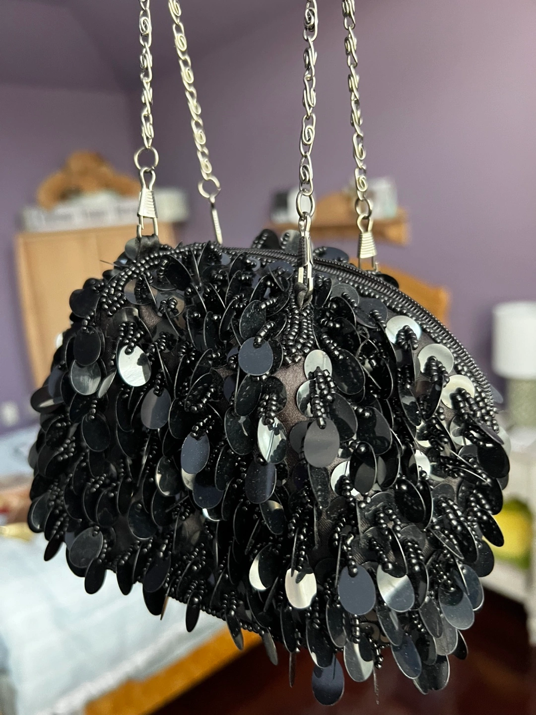 Selling a cute black sequin evening bag! It's in great condition and perfect for a night out or a special occasion. The bag has a chain strap and a zippered closure. It's a stylish and fun accessory to add to your wardrobe