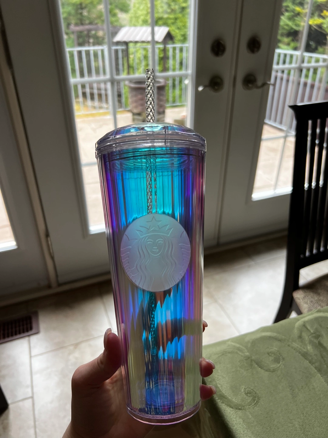 Selling a Starbucks iridescent Collideascope tumbler! It's in great condition and holds 24oz. Originally bought for $30 CAD. Perfect for keeping your drinks cold and looking stylish!