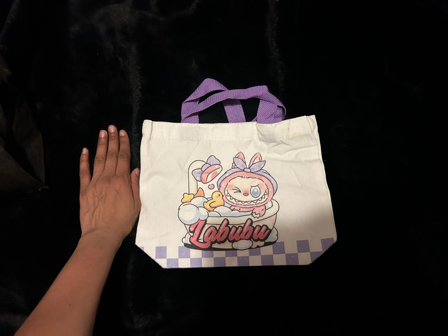115Check out this adorable Labubu canvas tote bag! It features a cute design with Labubu in a bathtub surrounded by bubbles and rubber duckies. The bag has purple handles and a checkerboard pattern at the bottom. Perfect for carrying your everyday essentials with a touch of whimsy!