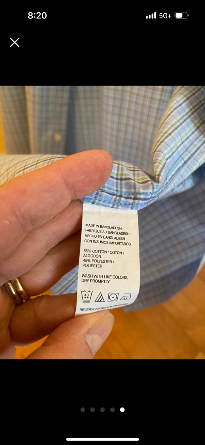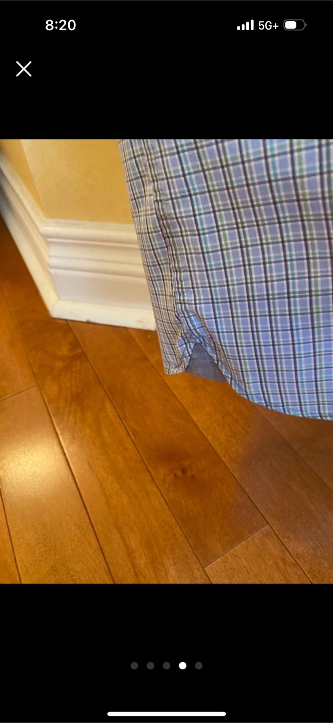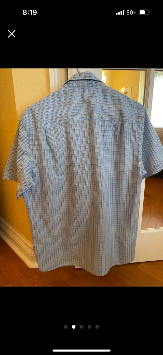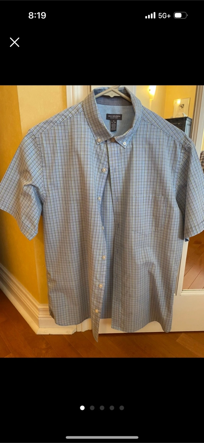 Van Heusen Never Tuck shirt in size M. The shirt is made of 55% cotton and 45% polyester. It features a blue and green plaid pattern and has a front pocket. It's in great condition and ready for a new home! Freshly laundered and pressed. From a pet and smoke free home. Pickup only in the St. Lawrence market area of downtown Toronto. Cash only.