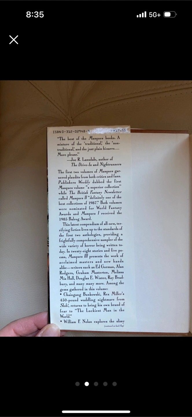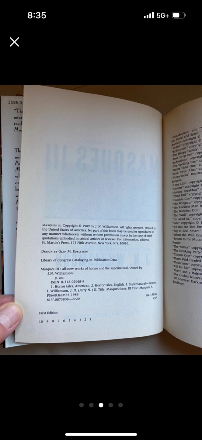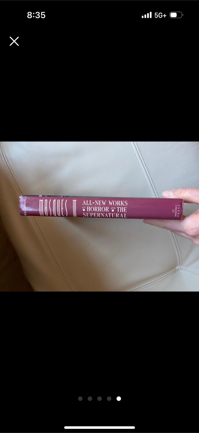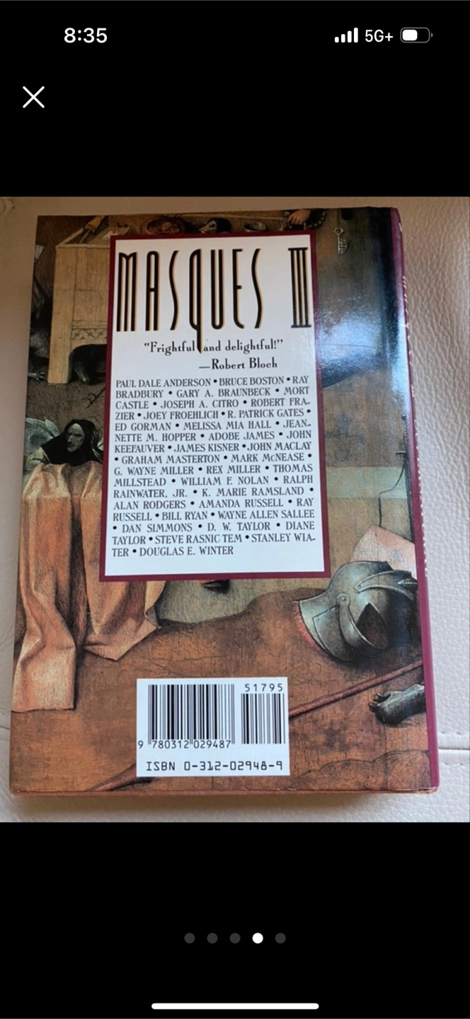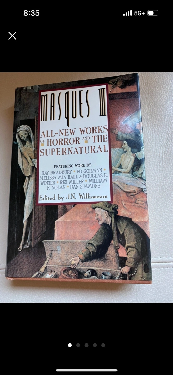 Selling a copy of Masques III: All-New Works of Horror and the Supernatural, edited by J.N. Williamson. This book features works by Ray Bradbury, Melissa Mia Hall, and Douglas E. Winter, among others. It's a collection of horror and supernatural tales that might be right up your alley! Contains 317 pages and is a first edition print.