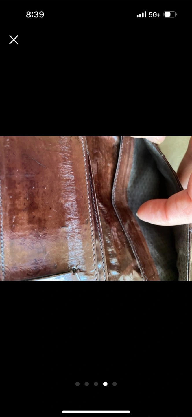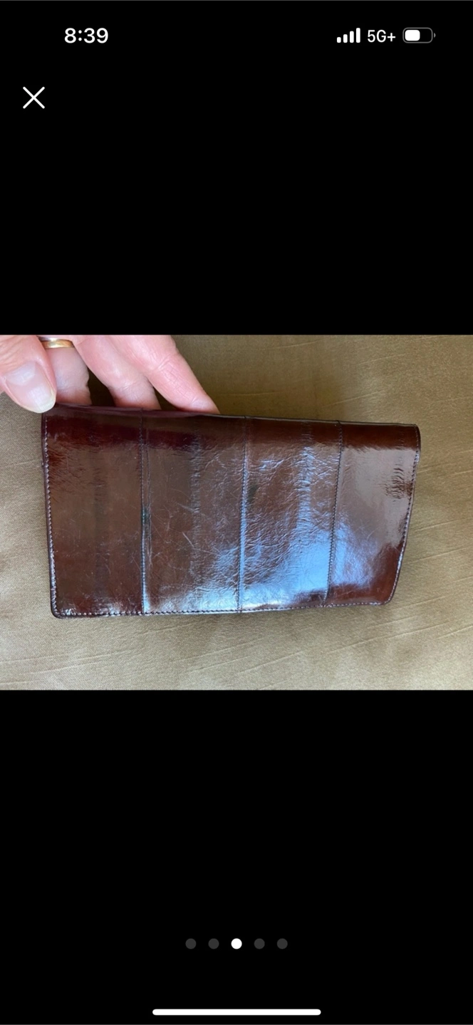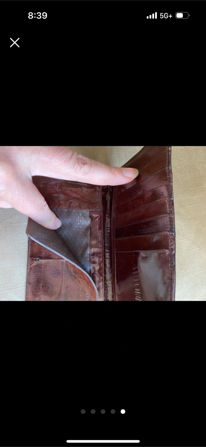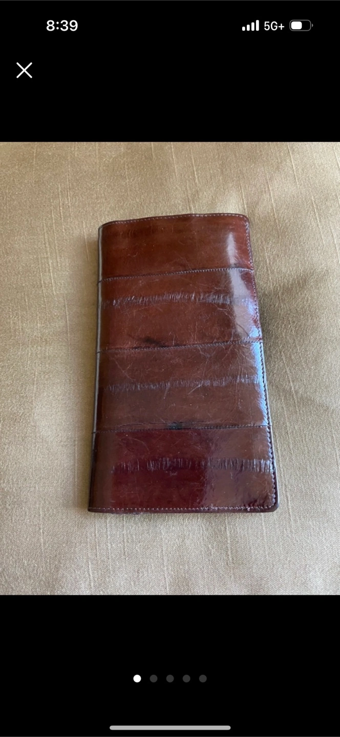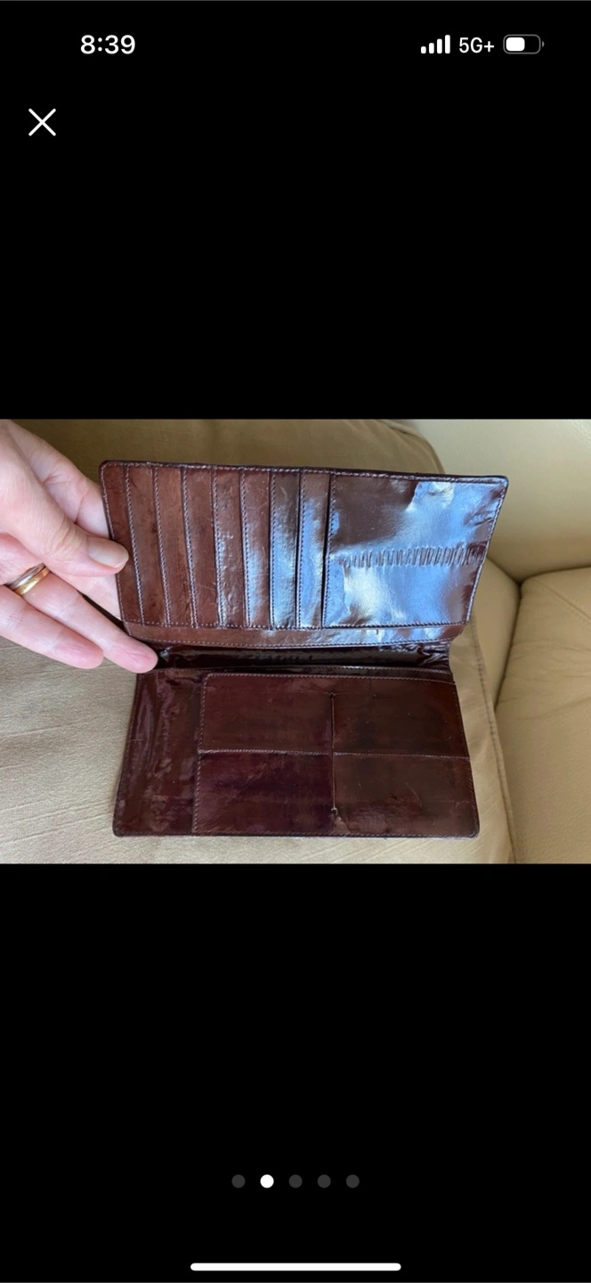 This is a brown leather wallet that has a unique texture and style. It has multiple slots for holding credit cards, cash and photo ID. It has never been used and in pristine condition.