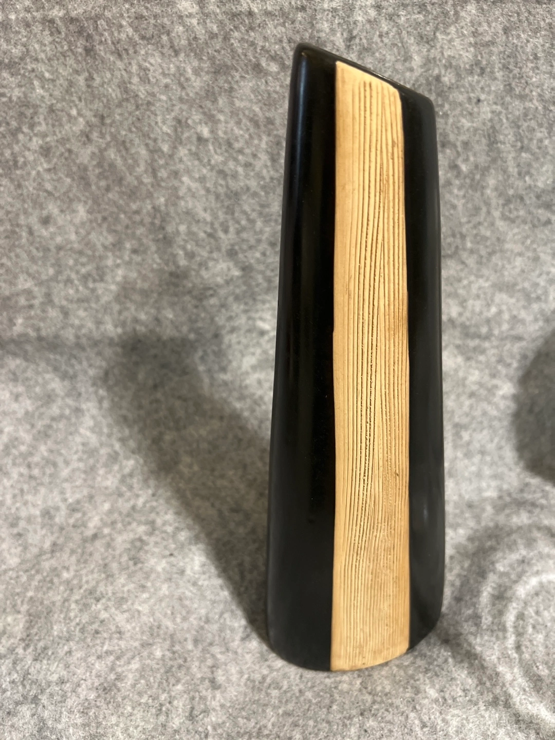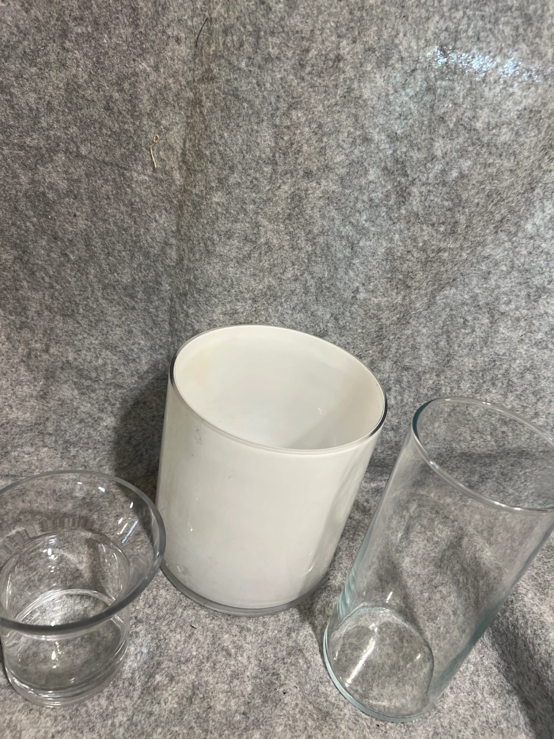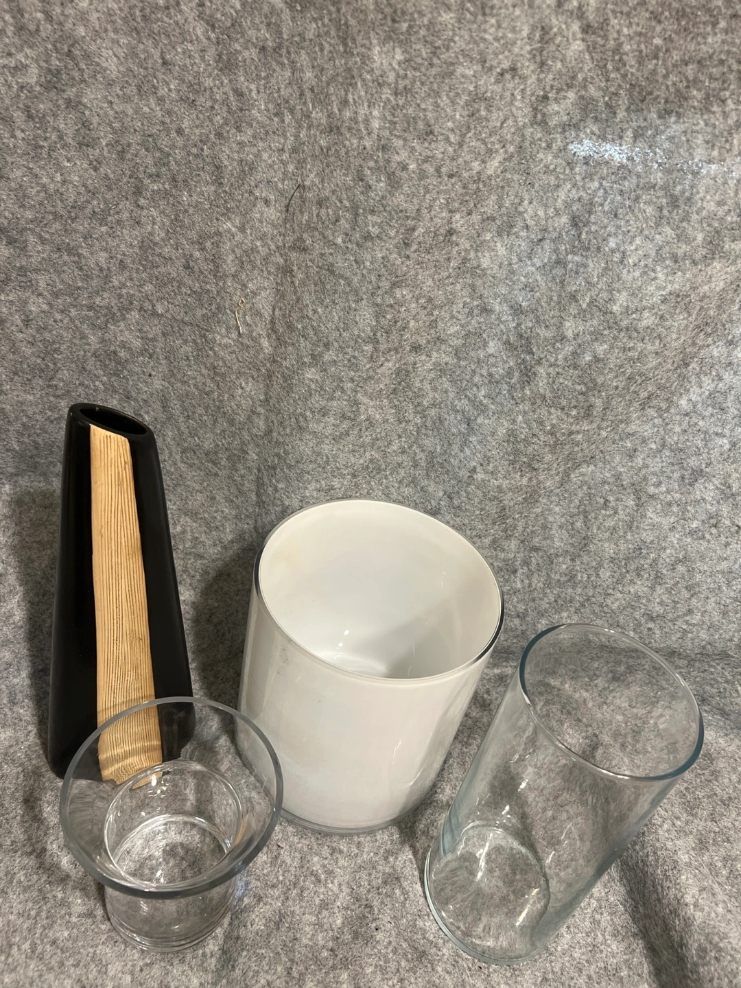 1000+Selling a set of assorted vases! There's a black vase with a textured stripe, a white opaque vase, and two clear glass vases of different sizes. They're perfect for adding a touch of style to any room