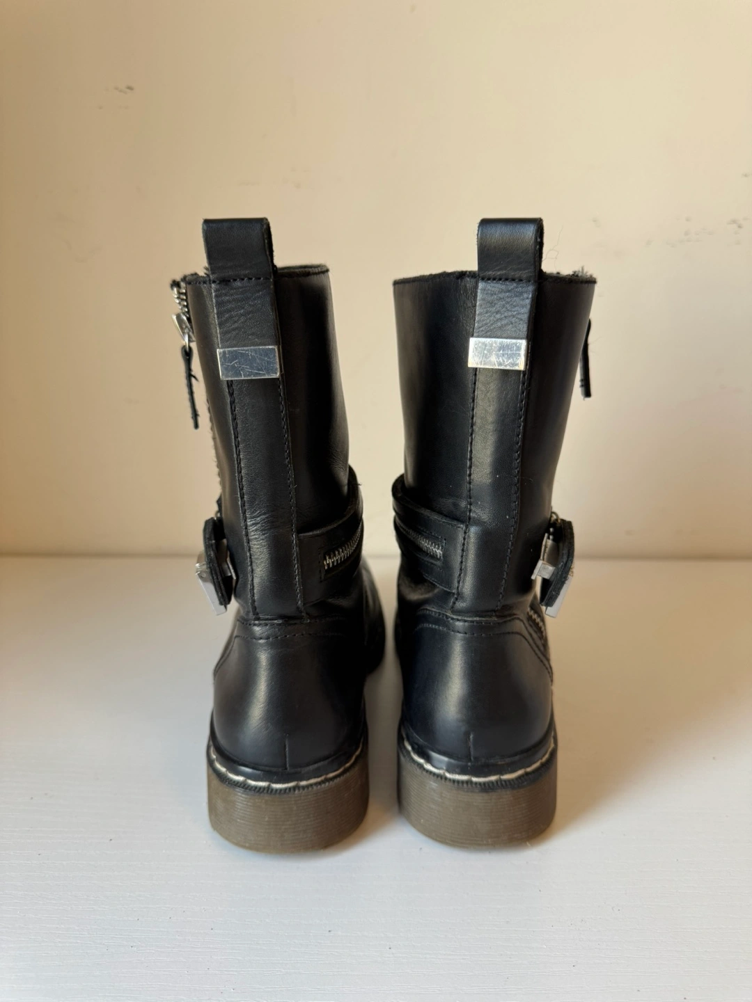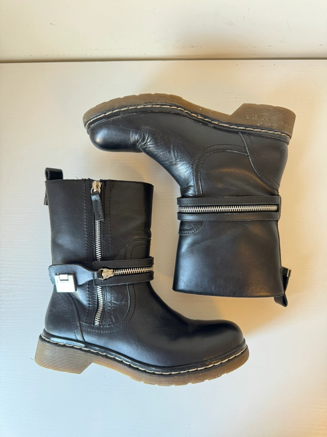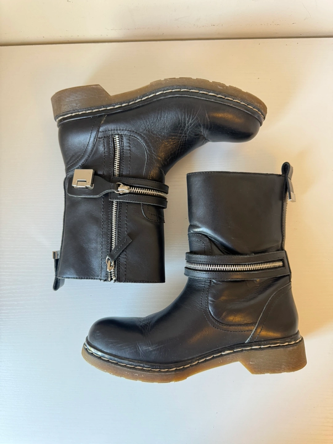 60These black leather boots have a cool zipper and buckle detail. They show some signs of wear but are still in good condition for everyday use. They'd be a great addition to your fall or winter wardrobe!