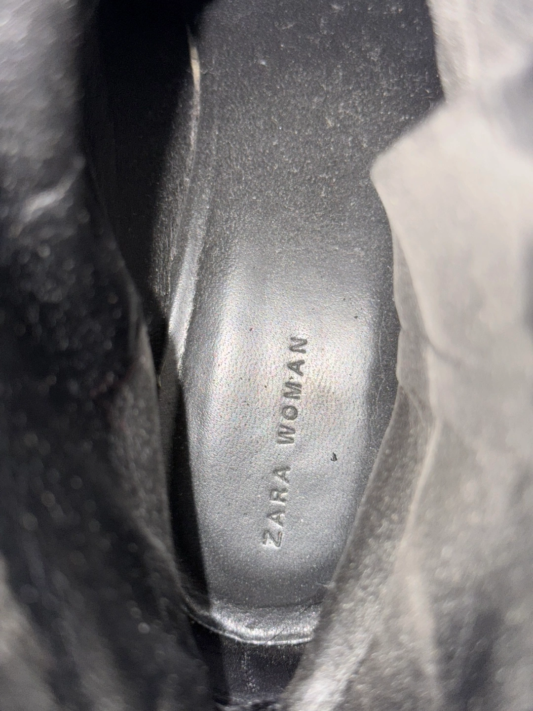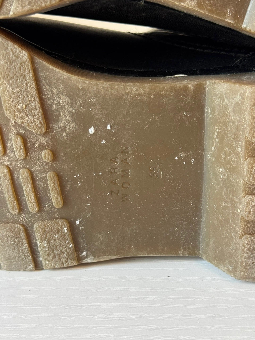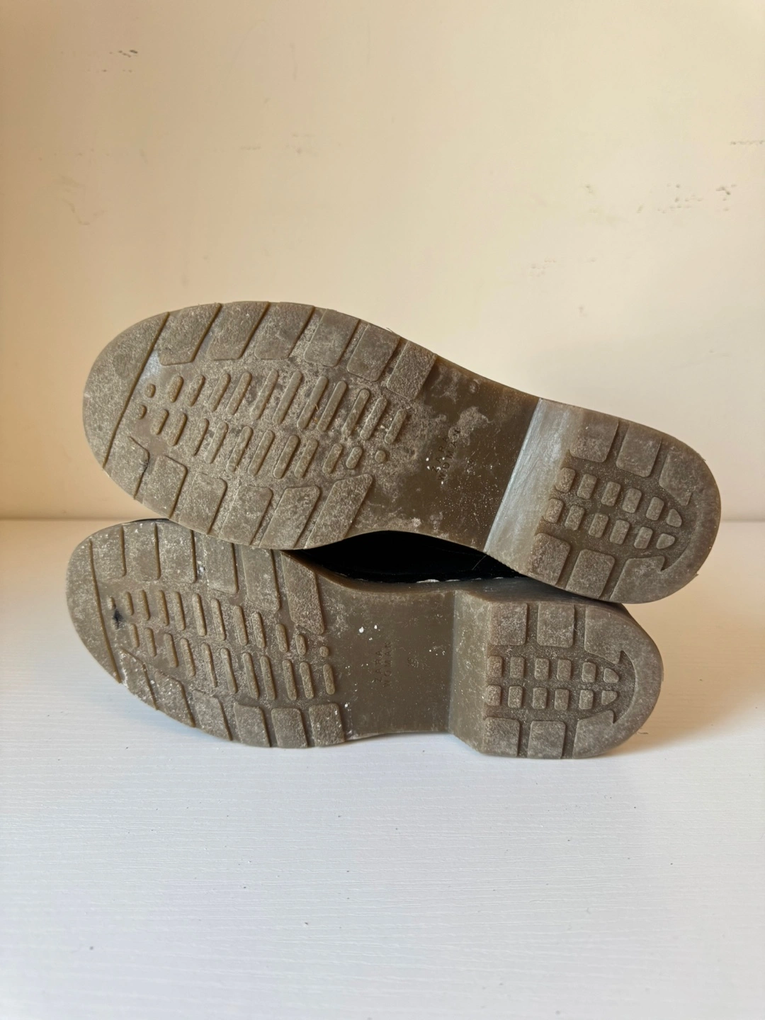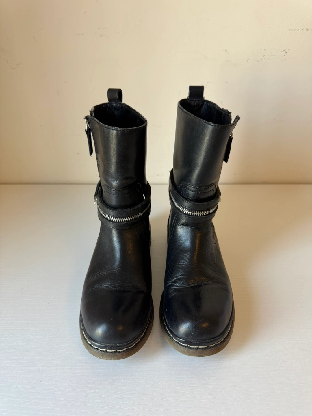 60These black leather boots have a cool zipper and buckle detail. They show some signs of wear but are still in good condition for everyday use. They'd be a great addition to your fall or winter wardrobe!