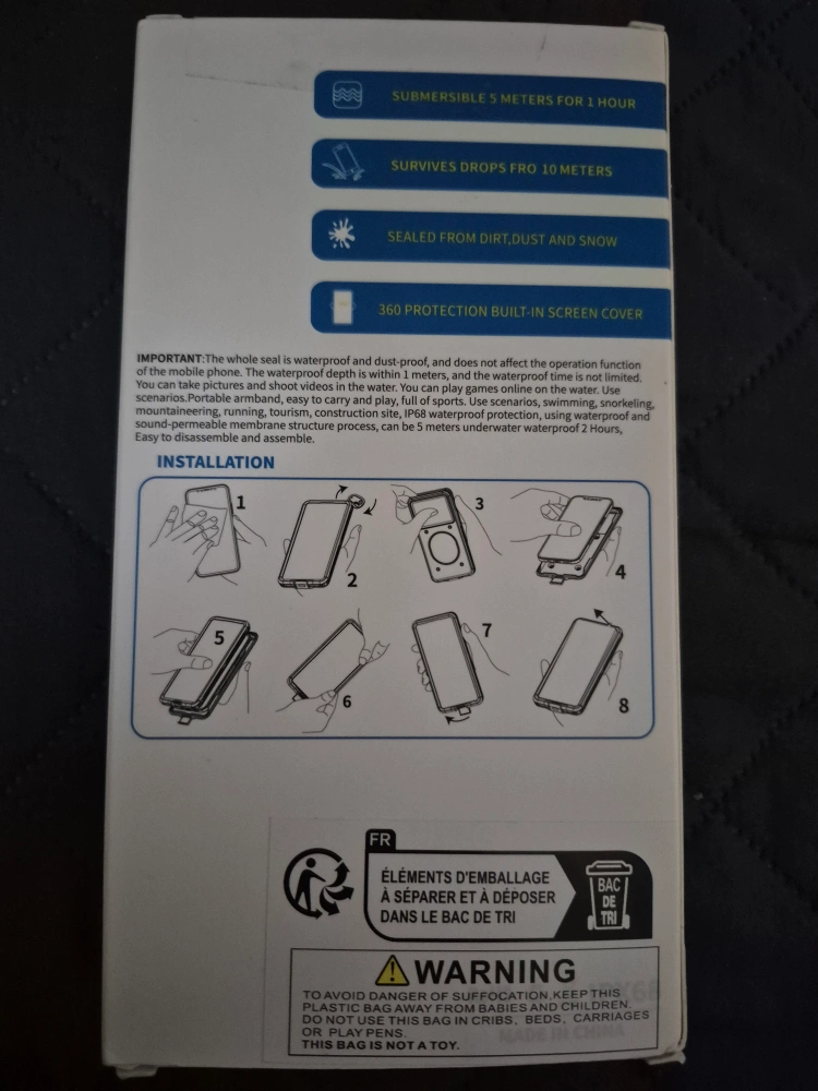 Selling a waterproof phone case, perfect for protecting your phone! It's designed for phones between 5.5 and 6.9 inches. Key features: - Submersible up to 5 meters for 1 hour - Survives drops from 10 meters - Sealed from dirt, dust, and snow - 360° protection with a built-in screen cover