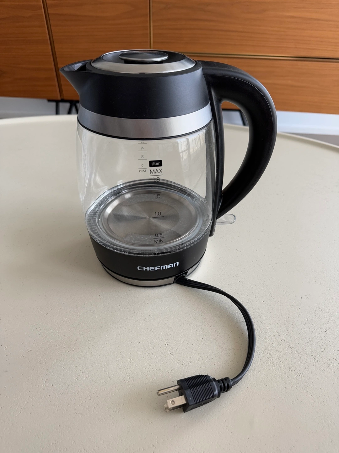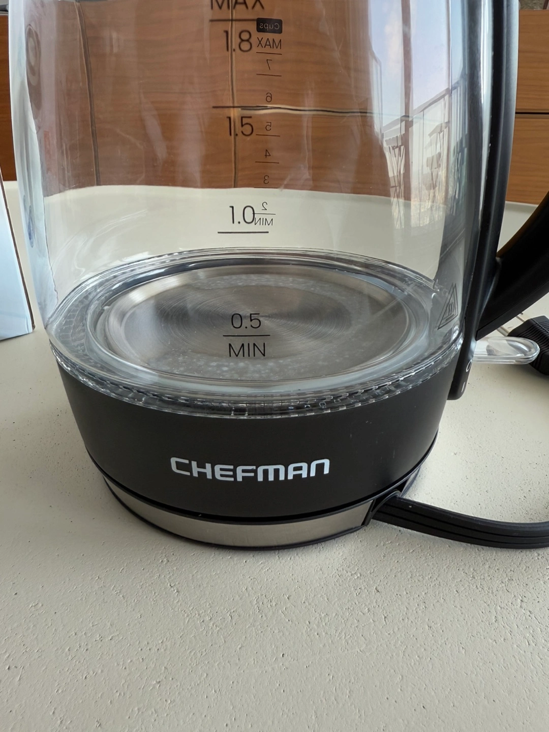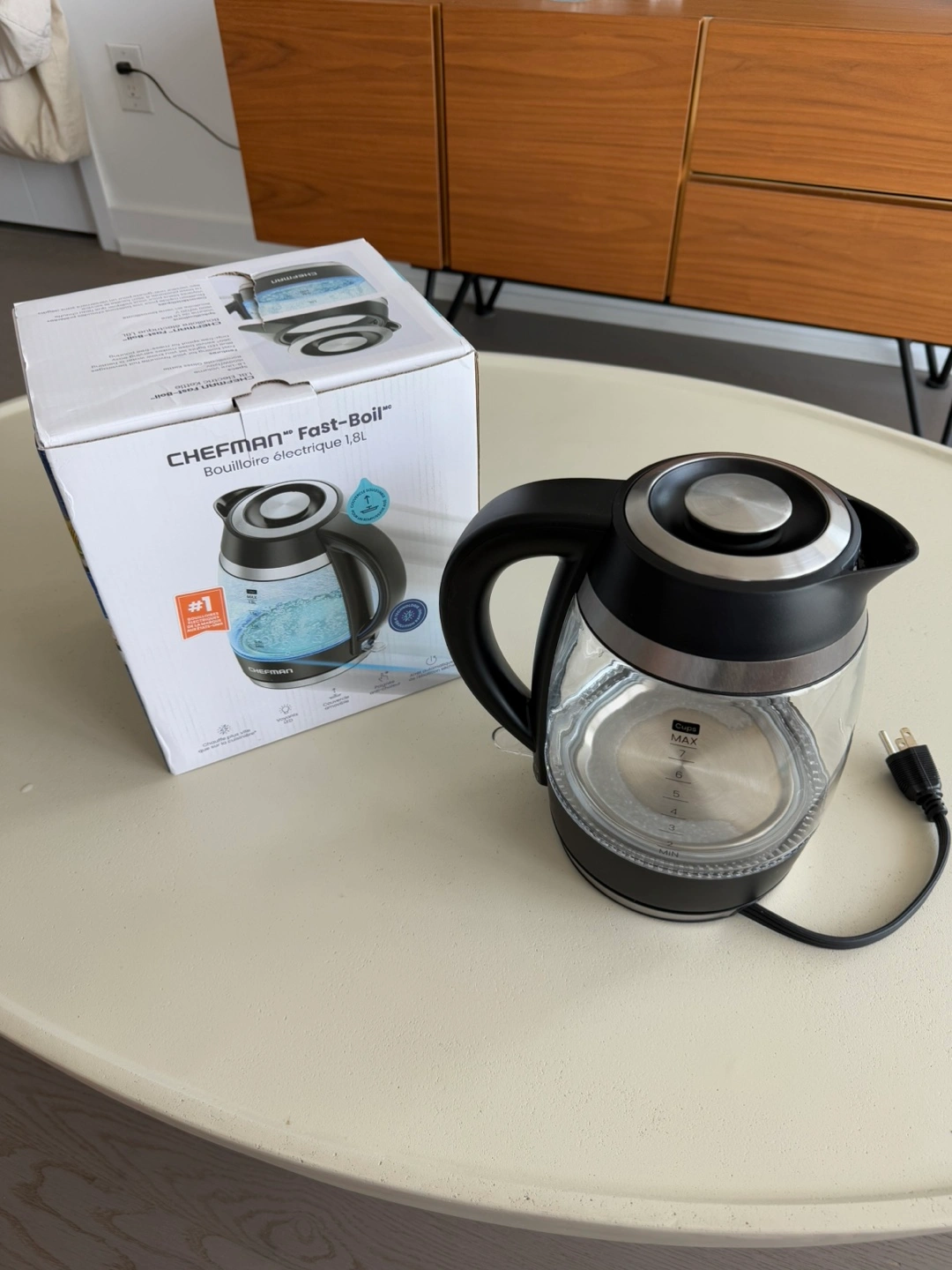 Selling an almost brand new Chefman Fast-Boil 1.8L electric kettle in excellent condition! It's perfect for quickly boiling water for tea, coffee, or anything else you need. The kettle has a clear glass body with a black base and handle. The original box is included!