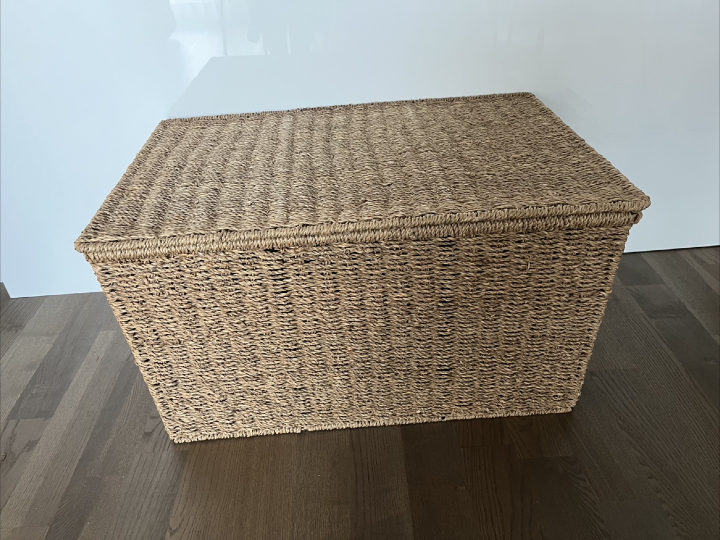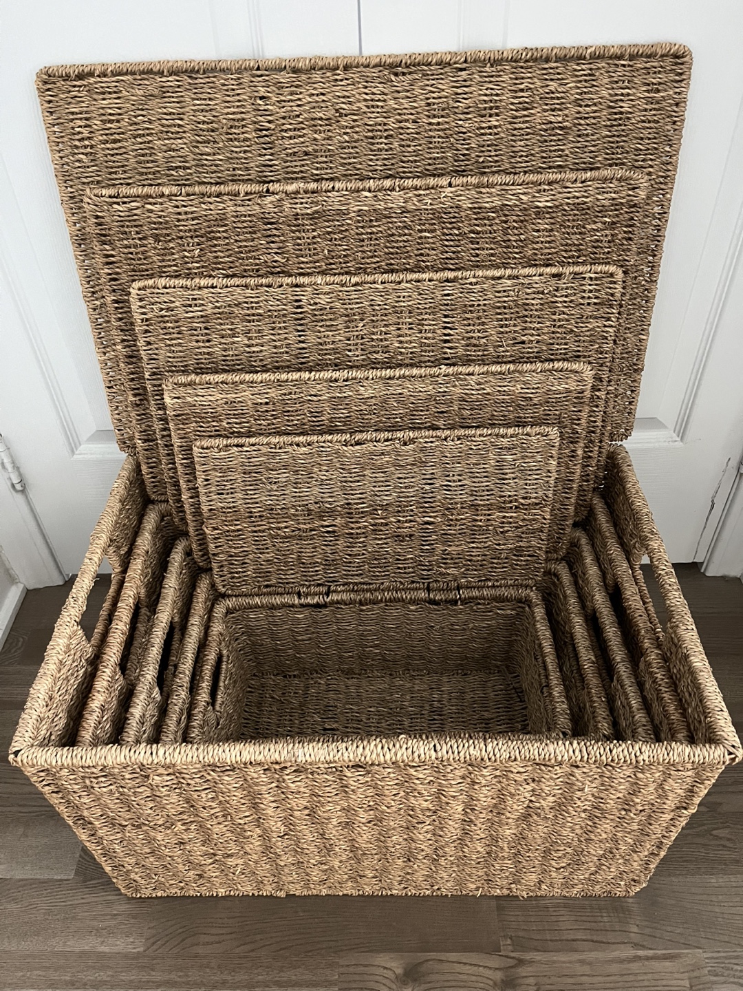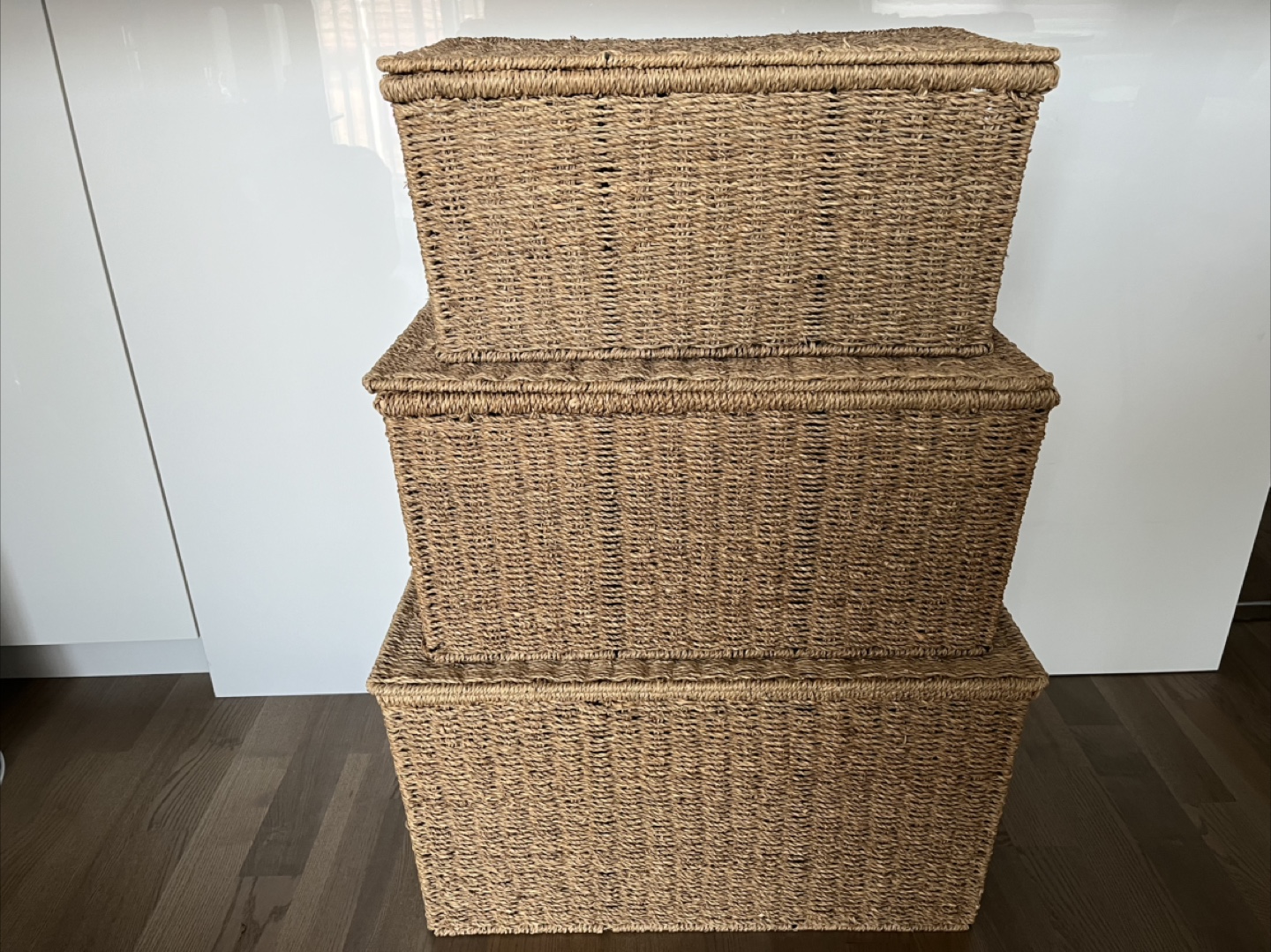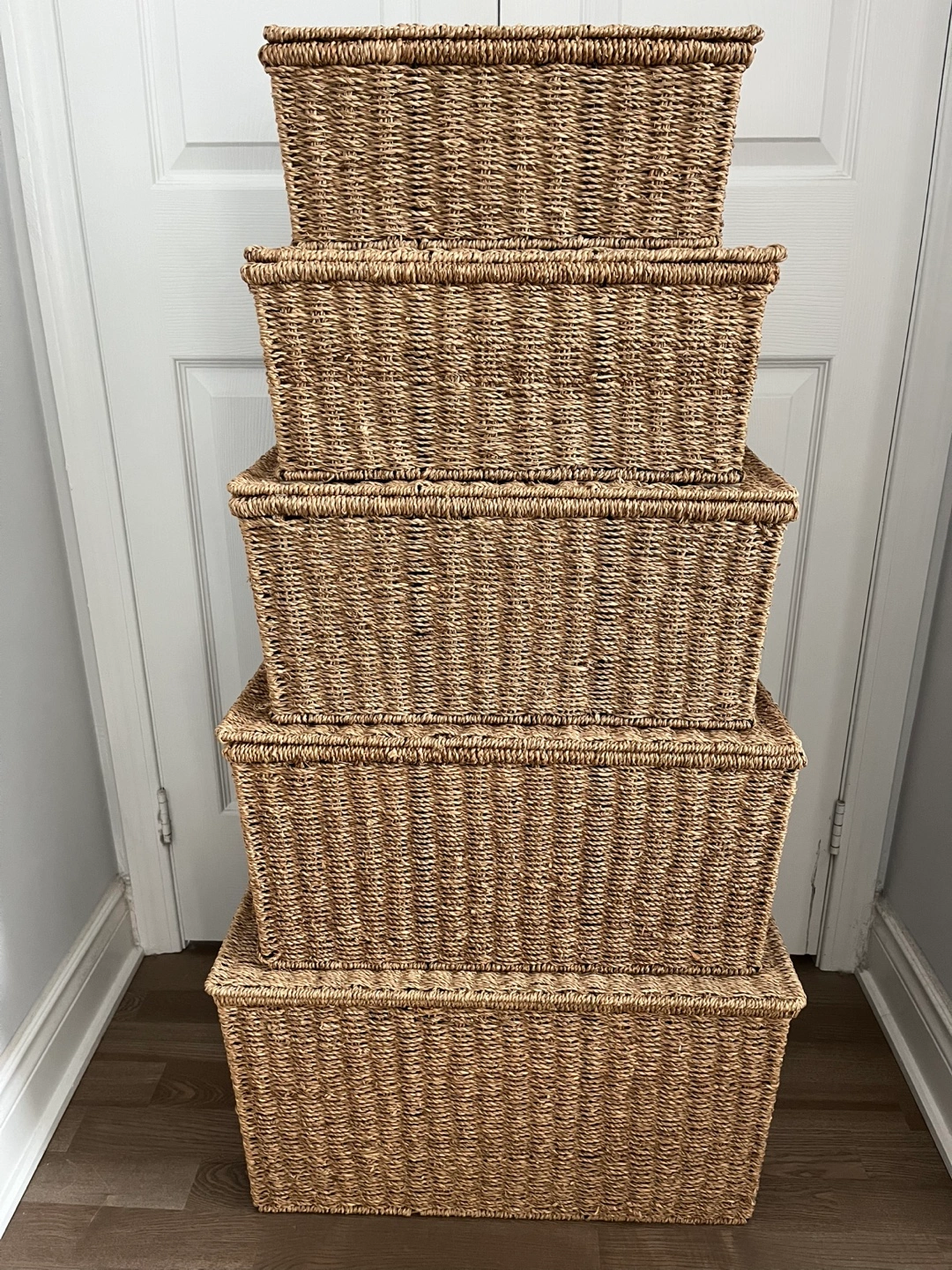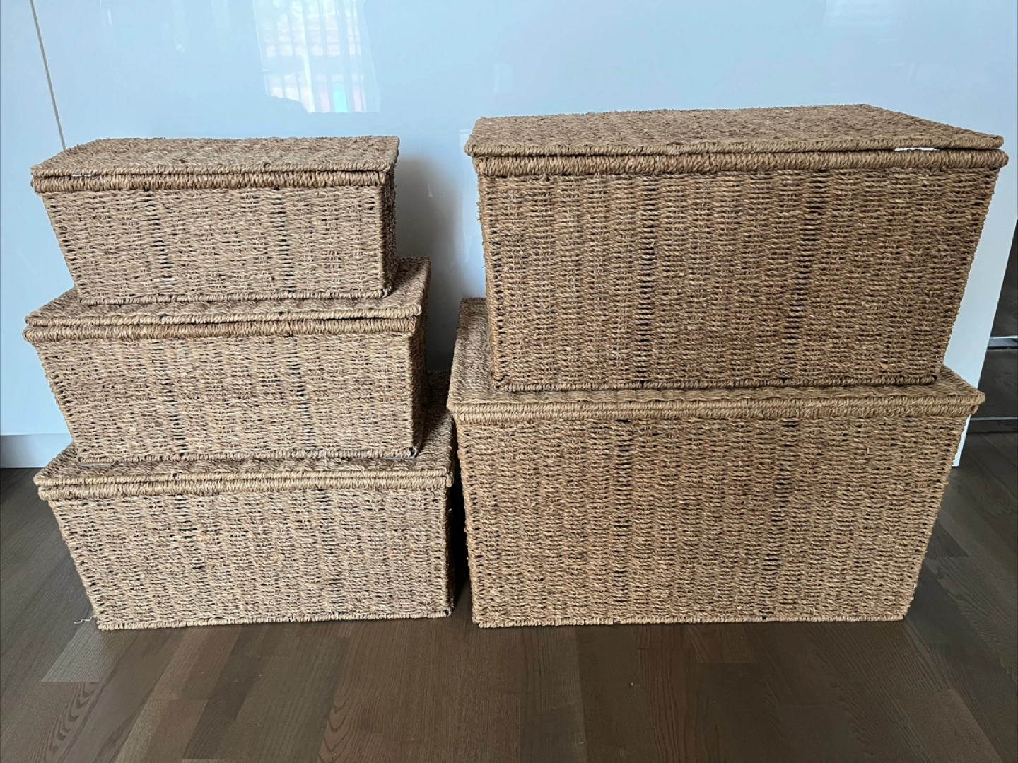 Selling a set of woven seagrass storage baskets with lids. They're perfect for organizing your space and adding a touch of natural style! The baskets are in great condition and come in various sizes, ideal for storing anything from linens to toys.