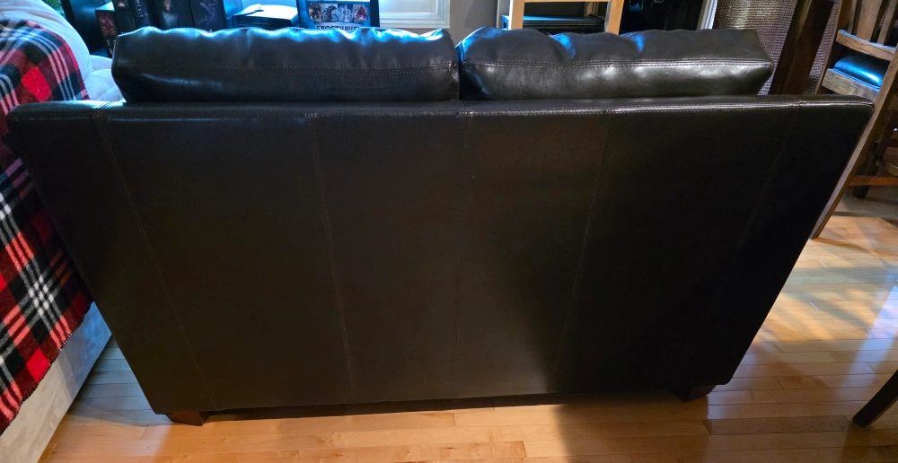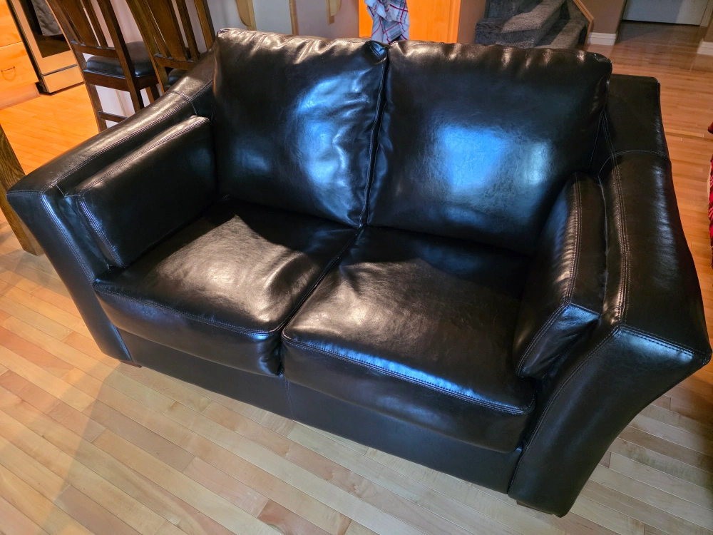 Selling a comfy leather loveseat in dark brown! It's perfect for a smaller space or as extra seating in a larger room. The leather is in good condition and has a nice, classic look. It's ready for a new home!