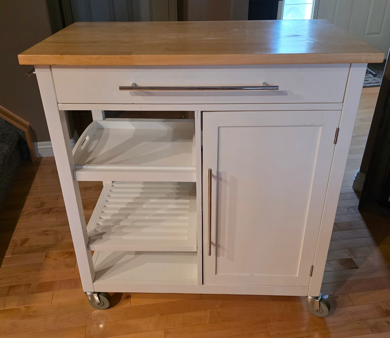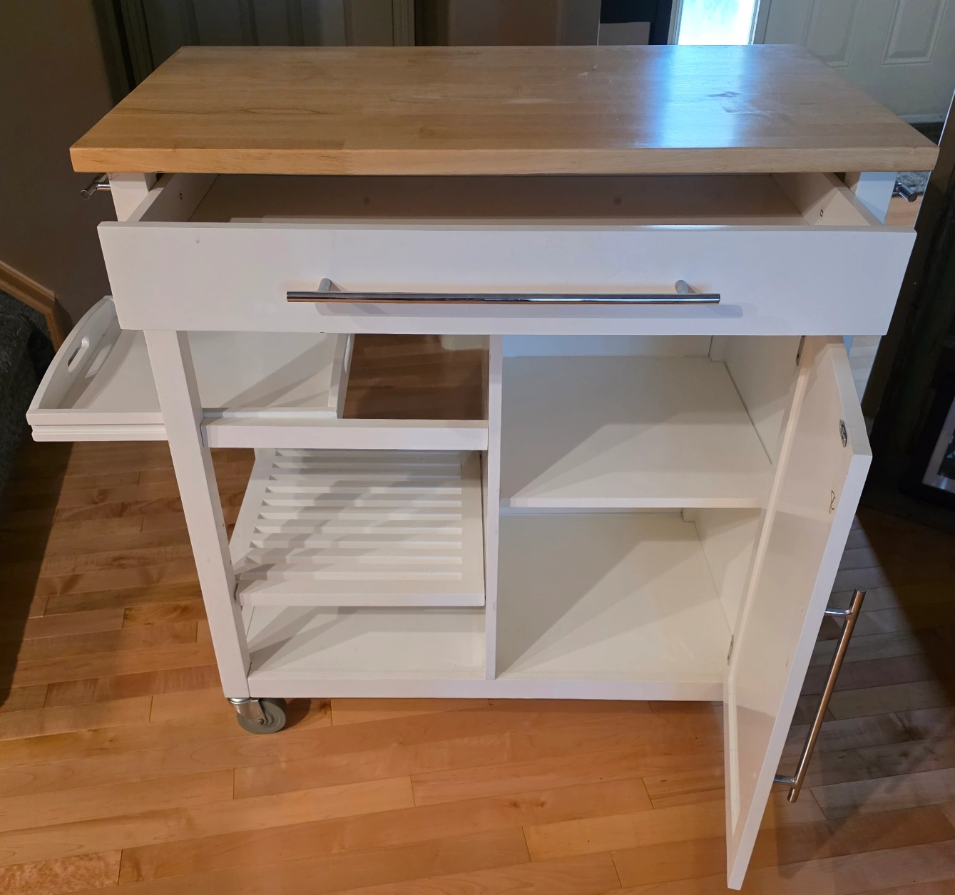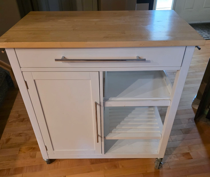 Selling a kitchen island cart in great condition! It features a white base with a wooden countertop. It has a drawer, a cabinet, and open shelving for storage. Perfect for adding extra counter space and storage to your kitchen