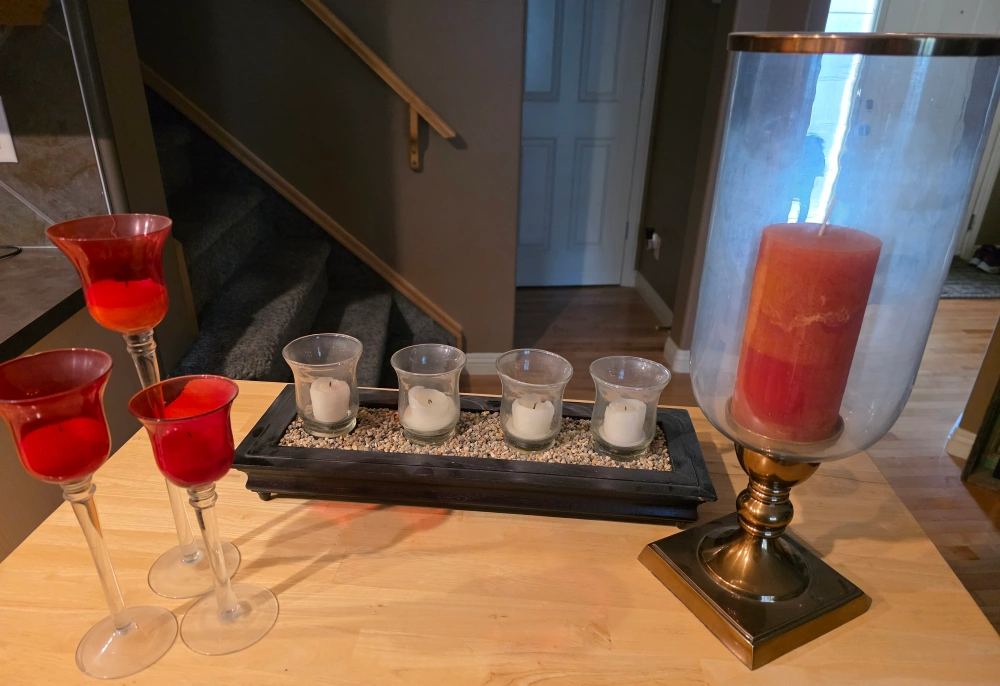 a candle holder set with red glass candle holders and a rectangular candle holder with four small candles. The larger candle holder has a clear glass cover and a bronze-colored base. Great for adding a cozy atmosphere to any room