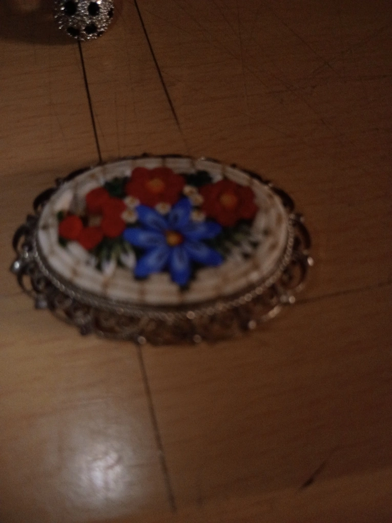 Selling a vintage floral brooch. It features red and blue flowers on a white background, set in an oval silver-tone frame. It's a lovely piece to add to any jewelry collection!