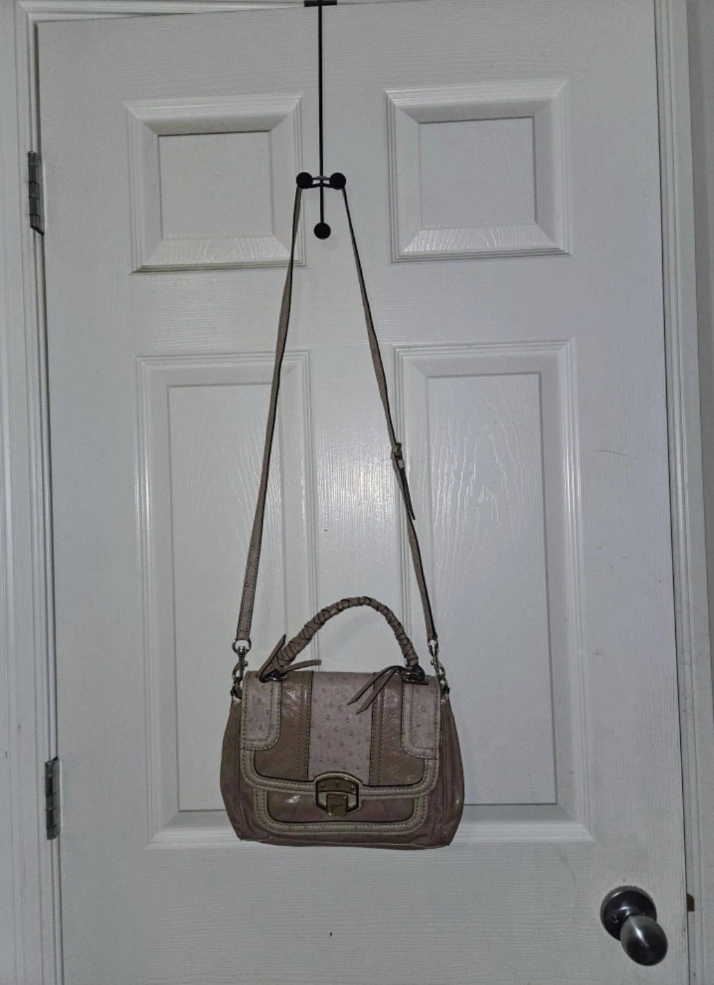 Shoulder strap, inside zipper pocket. Exterior is light brown with a textured pattern. Gold hardware. Interior is in excellent condition with no stains or tears. Spacious and perfect for everyday use