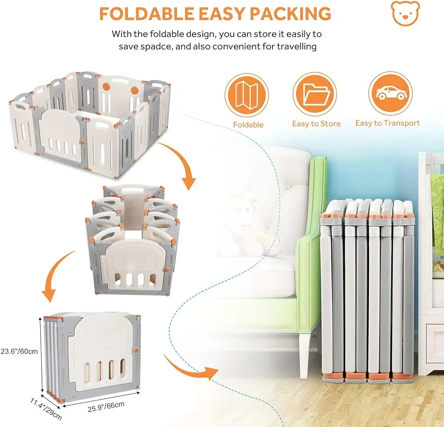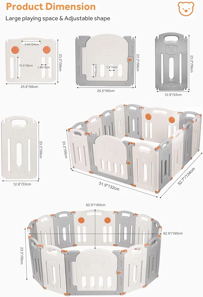This foldable baby playpen is perfect for creating a safe and fun play area for your little one! It's easy to store and transport, making it great for both home and travel. The playpen features a cute bear design and is made of durable materials. It's compatible with tiles and crawling mats, providing a comfortable surface for your baby to play on. The dimensions are approximately 66cm x 60cm when folded and can be arranged in various shapes when open