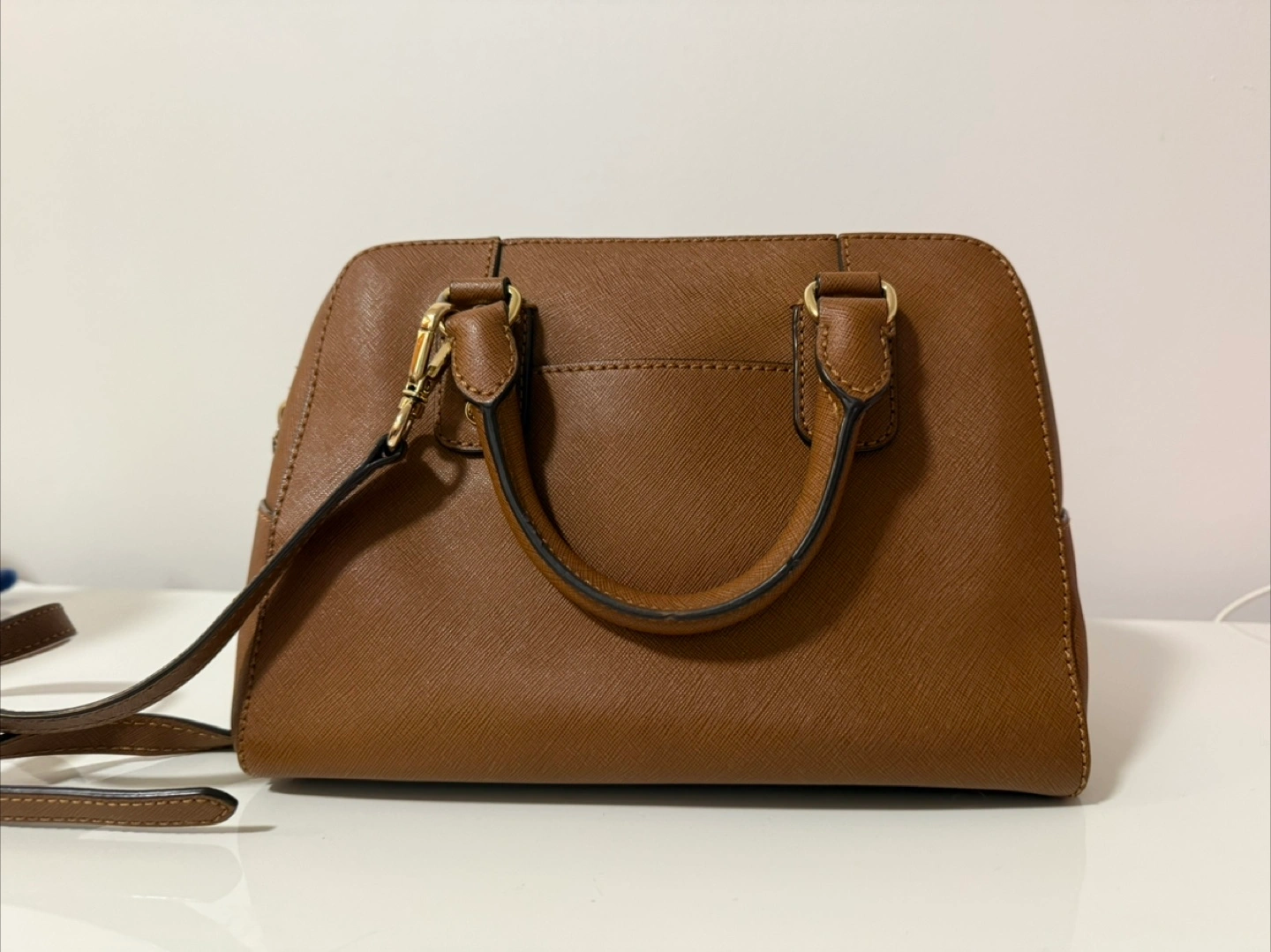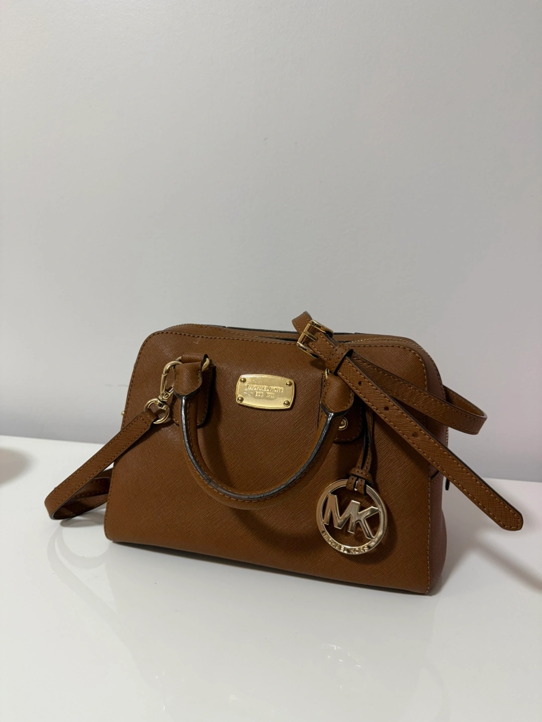 Selling a Michael Kors satchel in a lovely brown colour. It's in great condition as I only carried it two times. It has the classic MK logo charm and pockets inside.