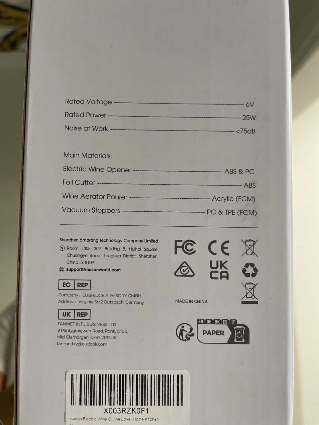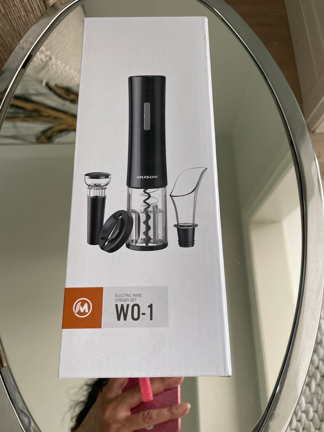Selling a Muson electric wine opener set, model WO-1. This set includes an electric wine opener, foil cutter, wine aerator pourer, and vacuum stoppers. The main materials are ABS & PC, ABS, Acrylic (FCM), and PC & TPE (FCM) respectively. Perfect for any wine enthusiast!