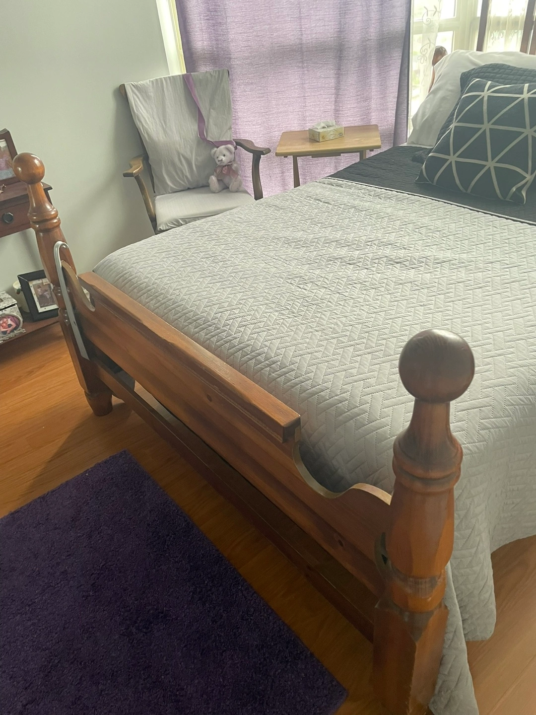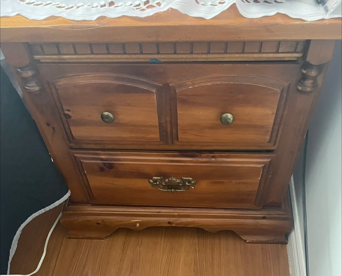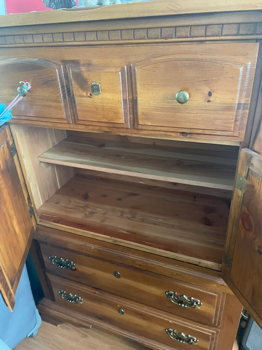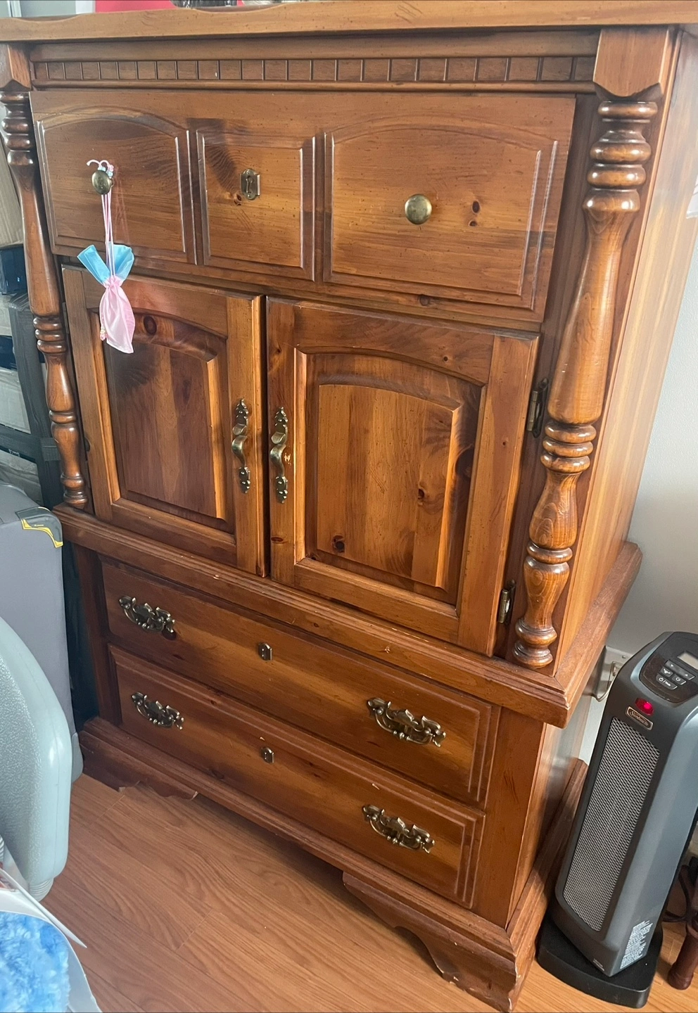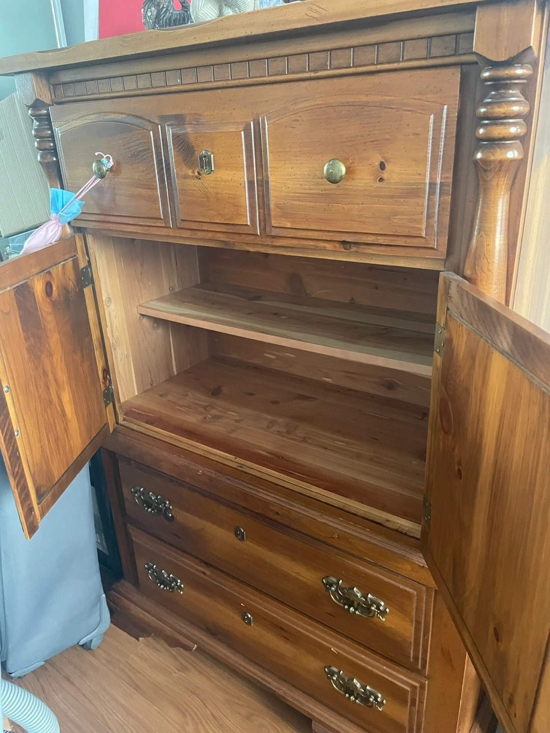 Selling a wooden armoire and bed frame set /box spring . The armoire features multiple drawers and doors for ample storage. The bed frame/box spring are in good condition. Perfect for adding a touch of rustic charm to your bedroom!