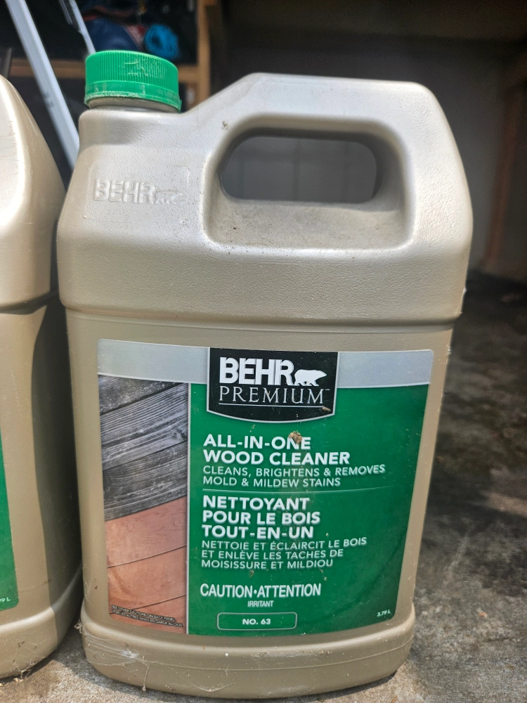 Selling 4 jugs of BEHR Premium All-In-one Wood Cleaner. Cleans, brightens, and removes mold and mildew stains. It's a 3.79L jug. Great for getting your deck or fence ready for summer! One jug is slightly less than half but other 3 are full.