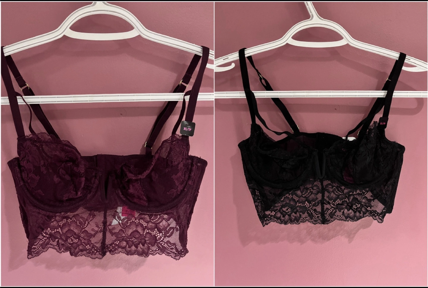 Bralettes from La Senza, one in black and one in burgundy. Both are extra small.