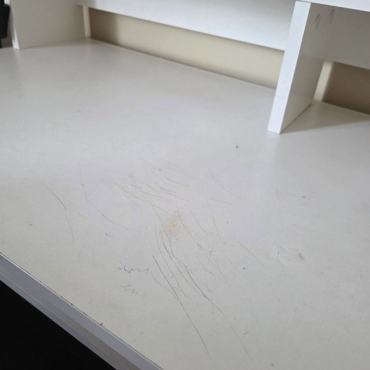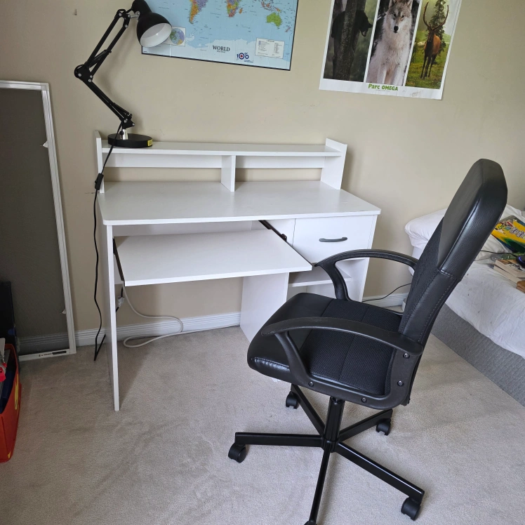 Selling a set of white desk and 1 LED table lamp. The desk has some wear and tear, including scratches and a chip on the edge. The LED lamp is just in perfect condition and function. Great for a student or home office setup!