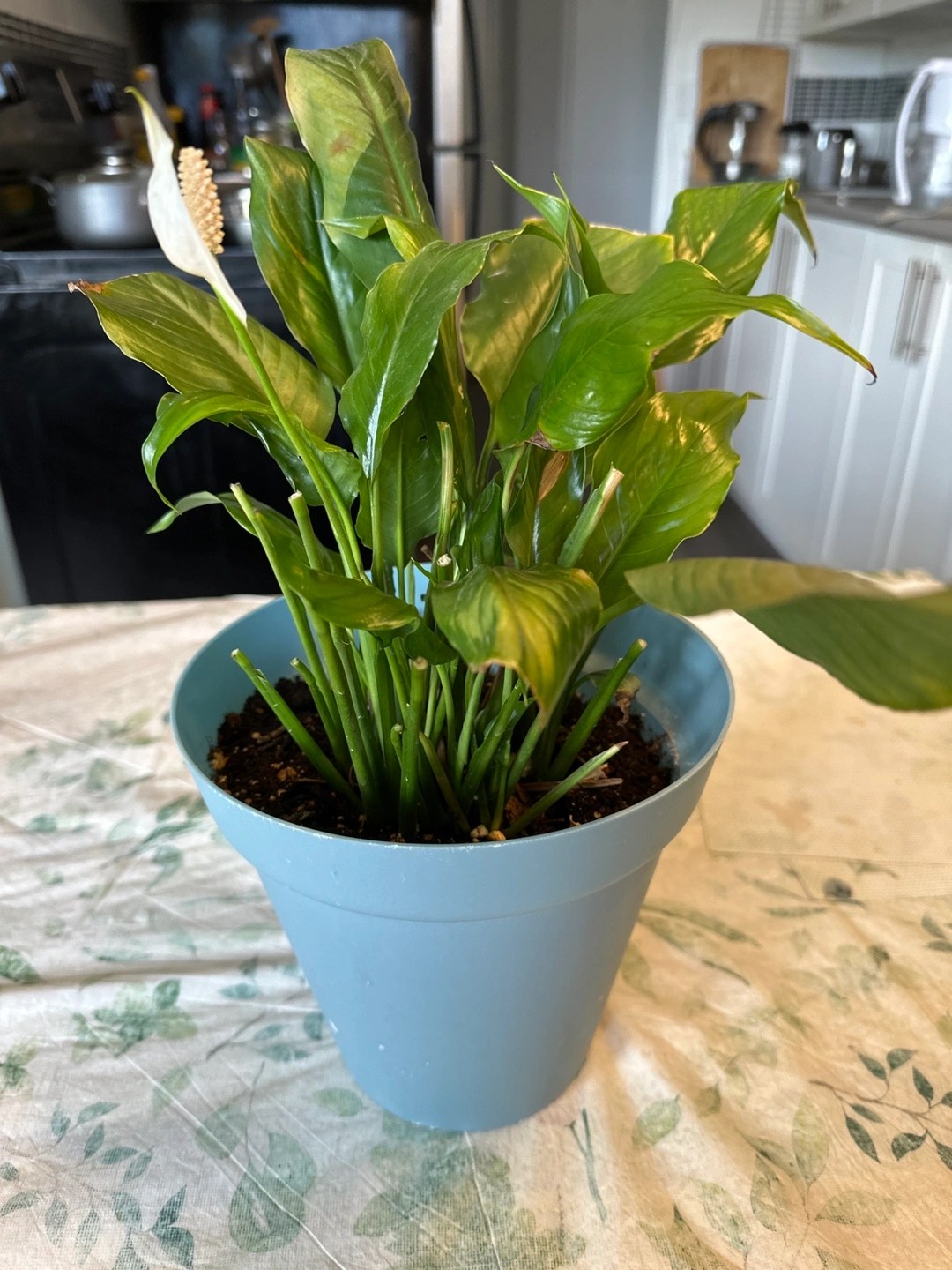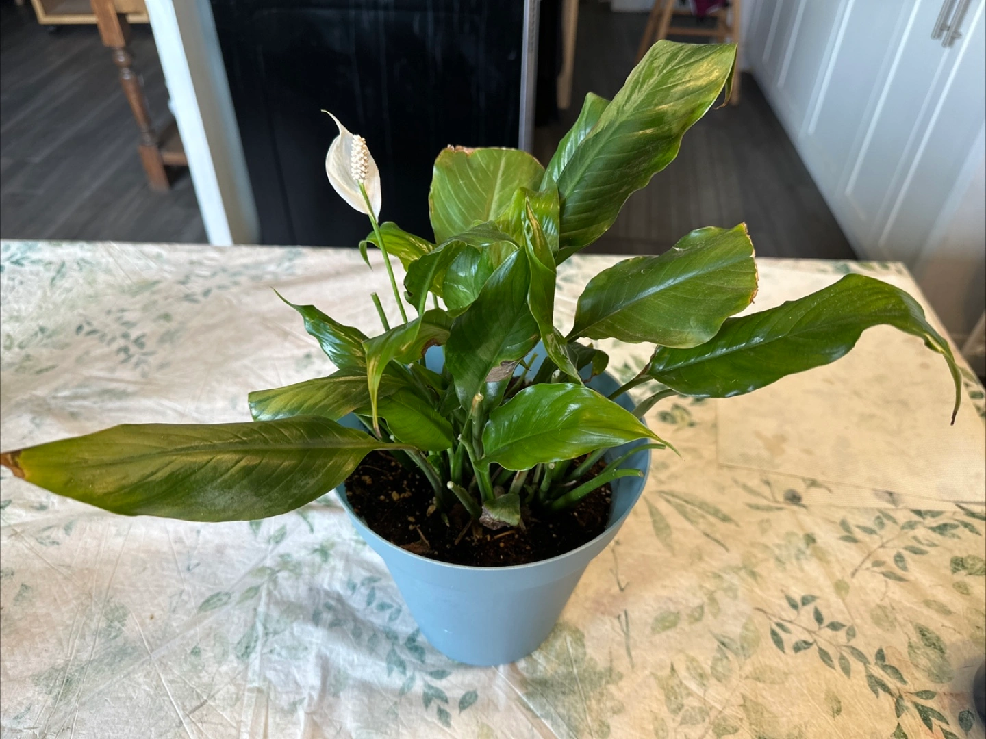 Peace lily plant in a light blue pot! It's a lovely addition to any home and brings a touch of nature indoors. This plant is known for its air-purifying qualities and beautiful white flowers when it blooms. It's been well cared for, and is ready to keep growing to brighten up your space.