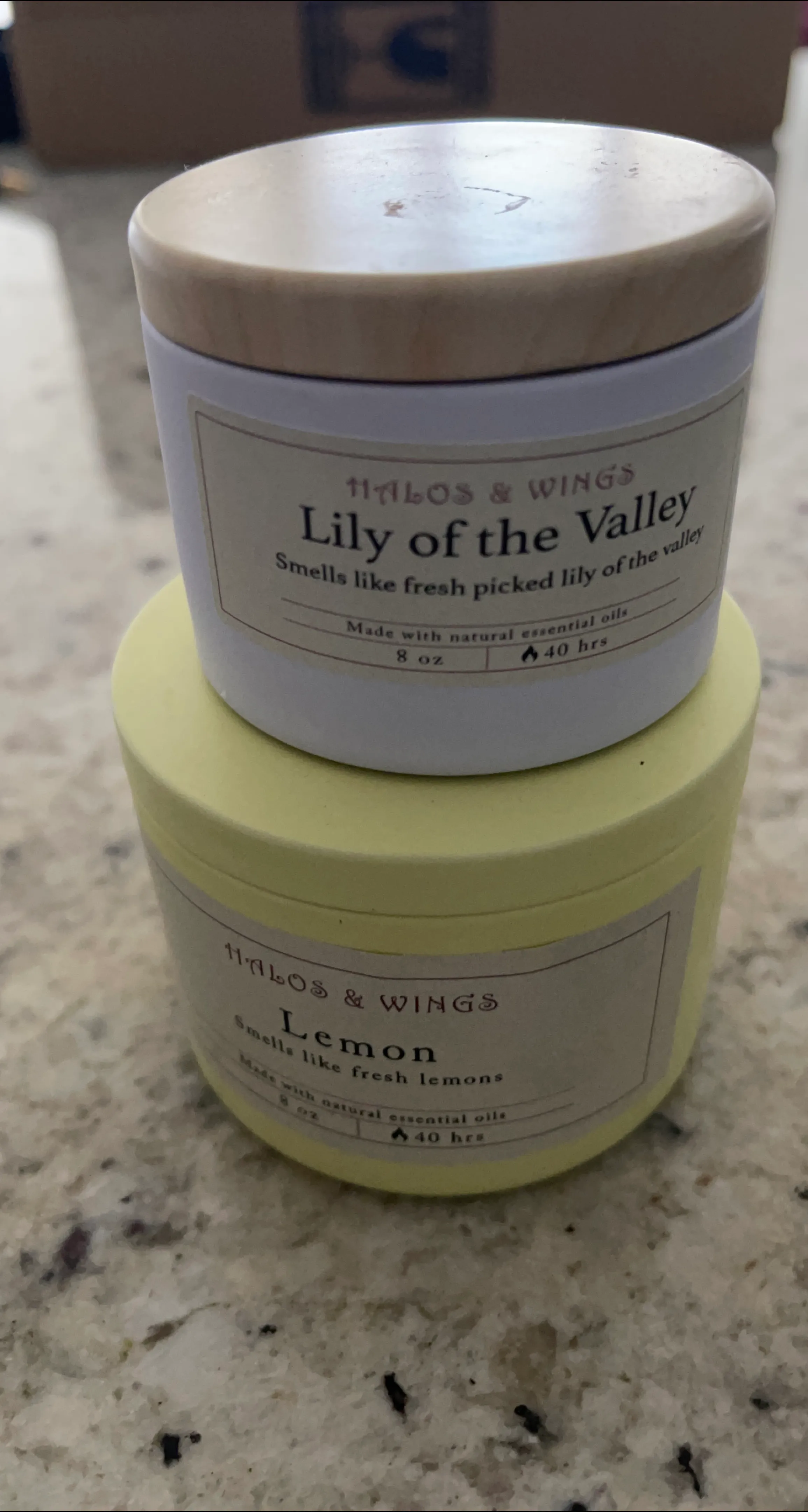 Selling two Halos & Wings candles! One is Lily of the Valley, and the other is Lemon. Both are made with natural essential oils and smell amazing. Each candle is 8 oz and has a burn time of 40 hours