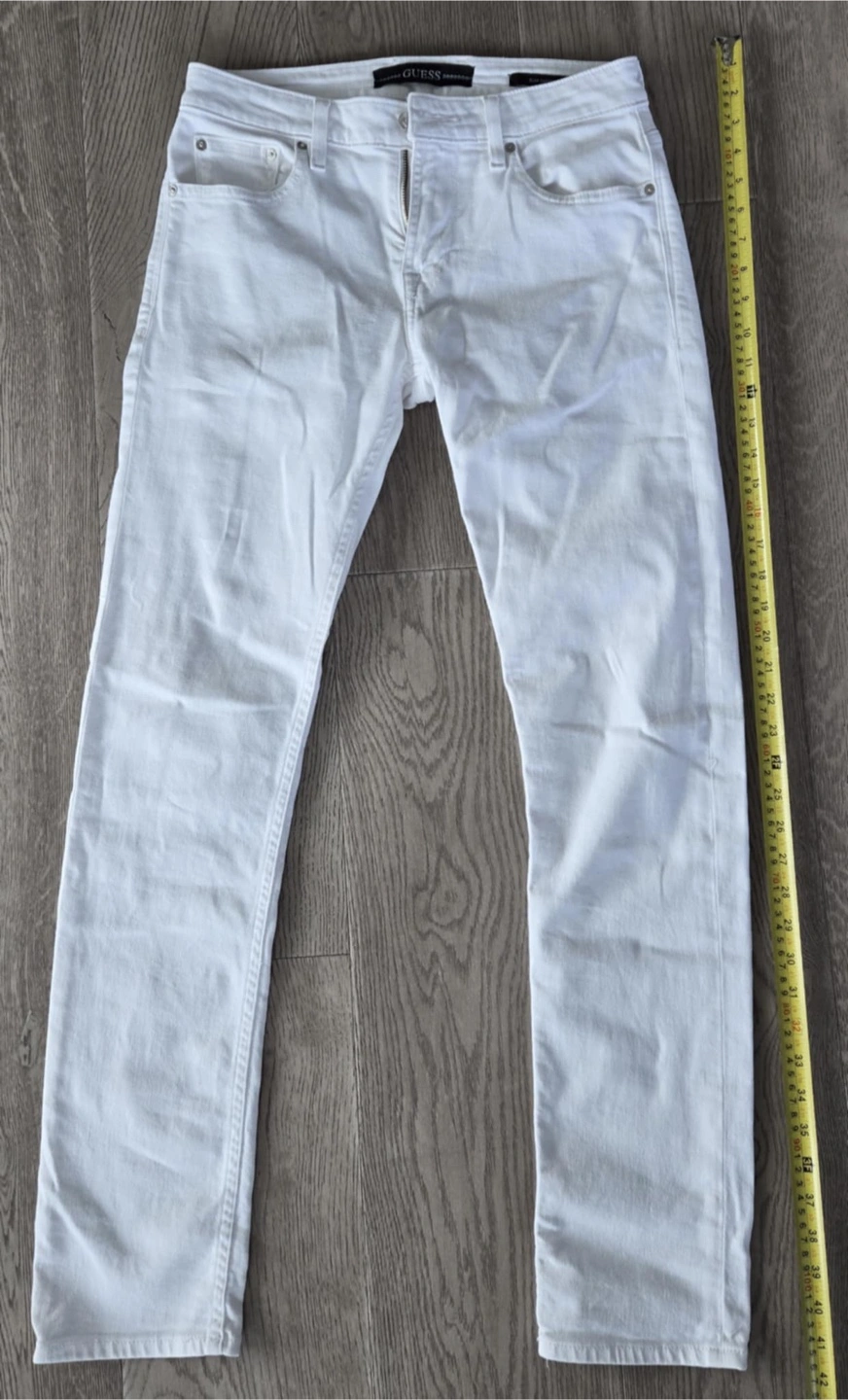 Selling a pair of Guess white denim jeans! They're in great condition and ready for a new home. The size appears to be around a 29 inch waist, 32-inch length based on the photos