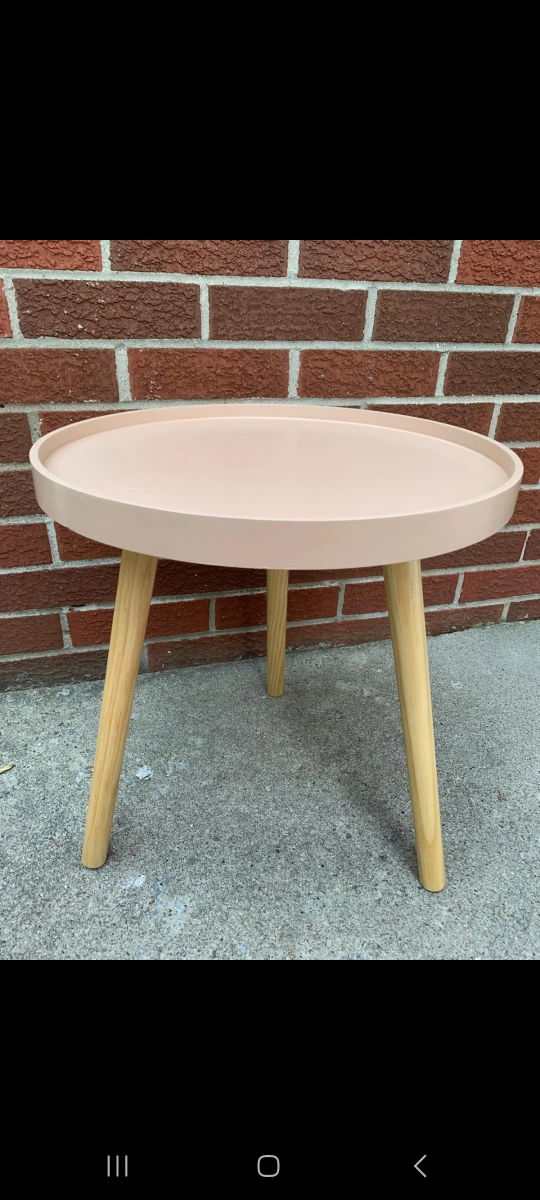 Selling a cute round side table! It's new features a pale pink top with light wood legs. Perfect for adding a touch of style to any room, easy to assemble and carry. Best cute gifting idea too.