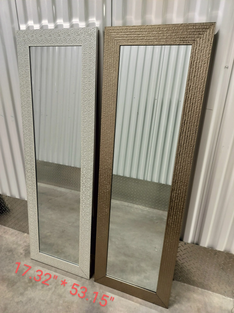 Two mirrors are available, each measuring 17.32" x 53.15". One has a white frame, and the other has a brown frame. They're in great condition and ready to brighten up your space