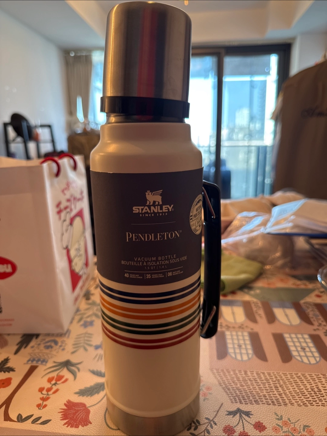 161Selling a Stanley Pendleton vacuum bottle! It keeps drinks hot for up to 40 hours and cold for up to 35 hours. It can also keep ice for 6 hours. This bottle has a 1.5 QT (1.4 L) capacity, perfect for staying hydrated on the go